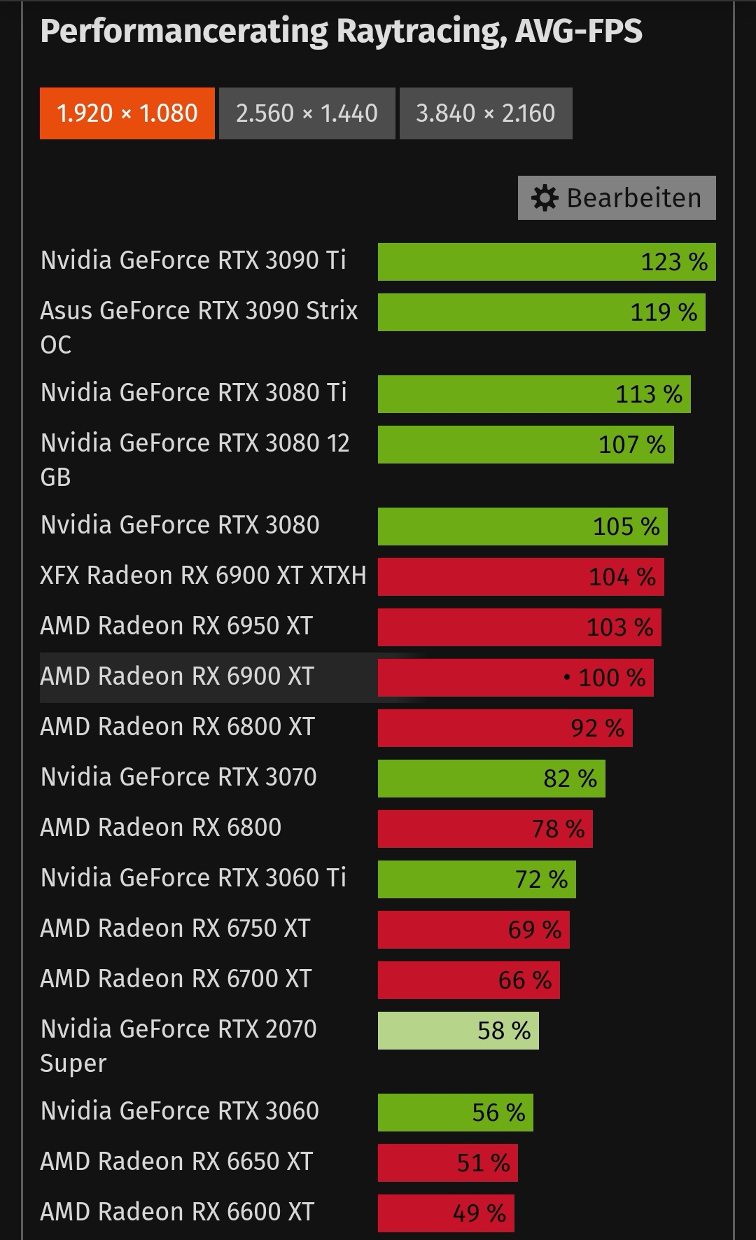 Insbesondere in 1080p schlägt sich AMD mittlerweile sehr passabel mit Raytracing, auch wenn Nvidia noch immer ganz passable in Front liegt.Easy1991 schrieb:Amd hat schon gut nachgebessert