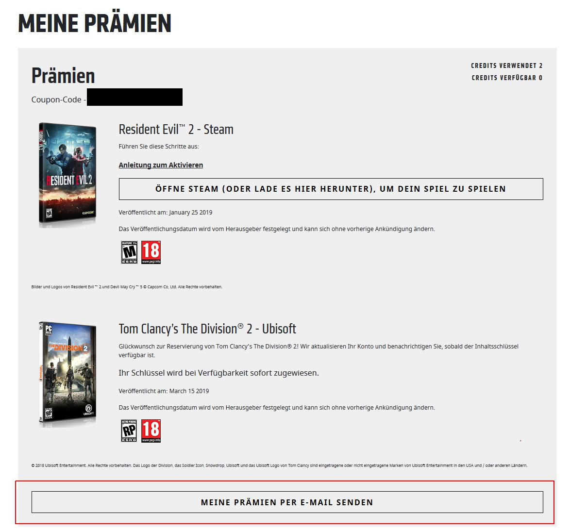 Log dich mal auf der AMD reward seite ein ,und schau dort in deinem Account. Bei mir war RE2 schon zum aktivieren über steam aktiv. (hatte auch die ganze zeit keine email bekommen)