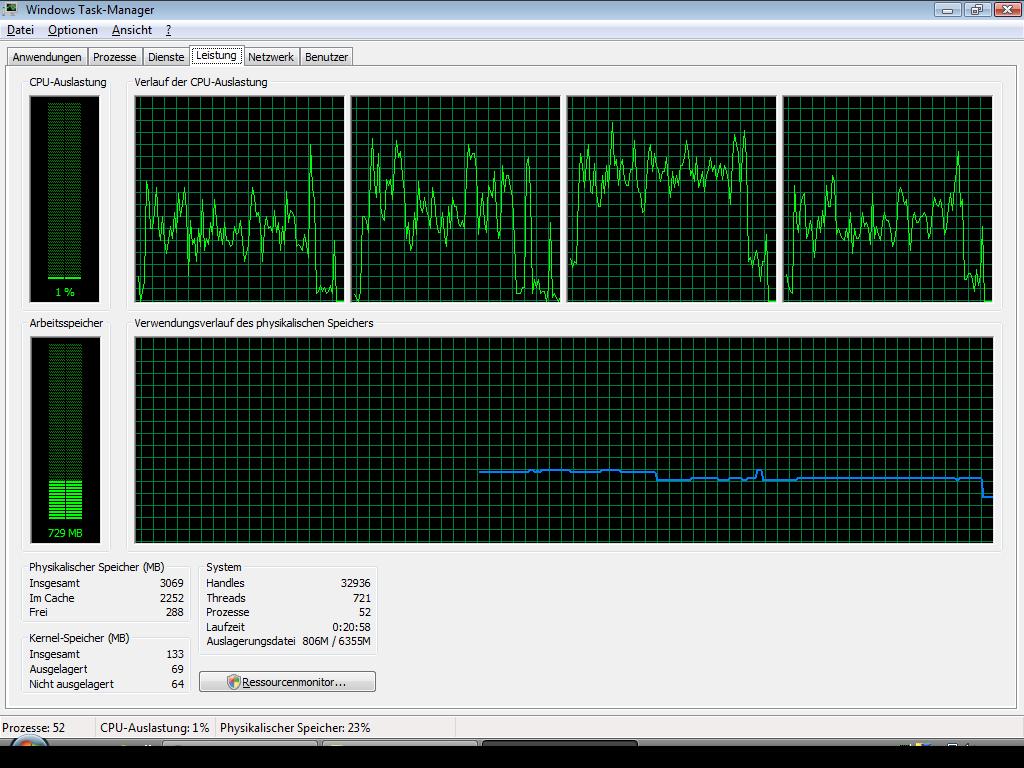 System: Q6600 @ 3,2 GHz, 4 GB RAM, Nvidia GeForce 9800 GTX+ 512 MB