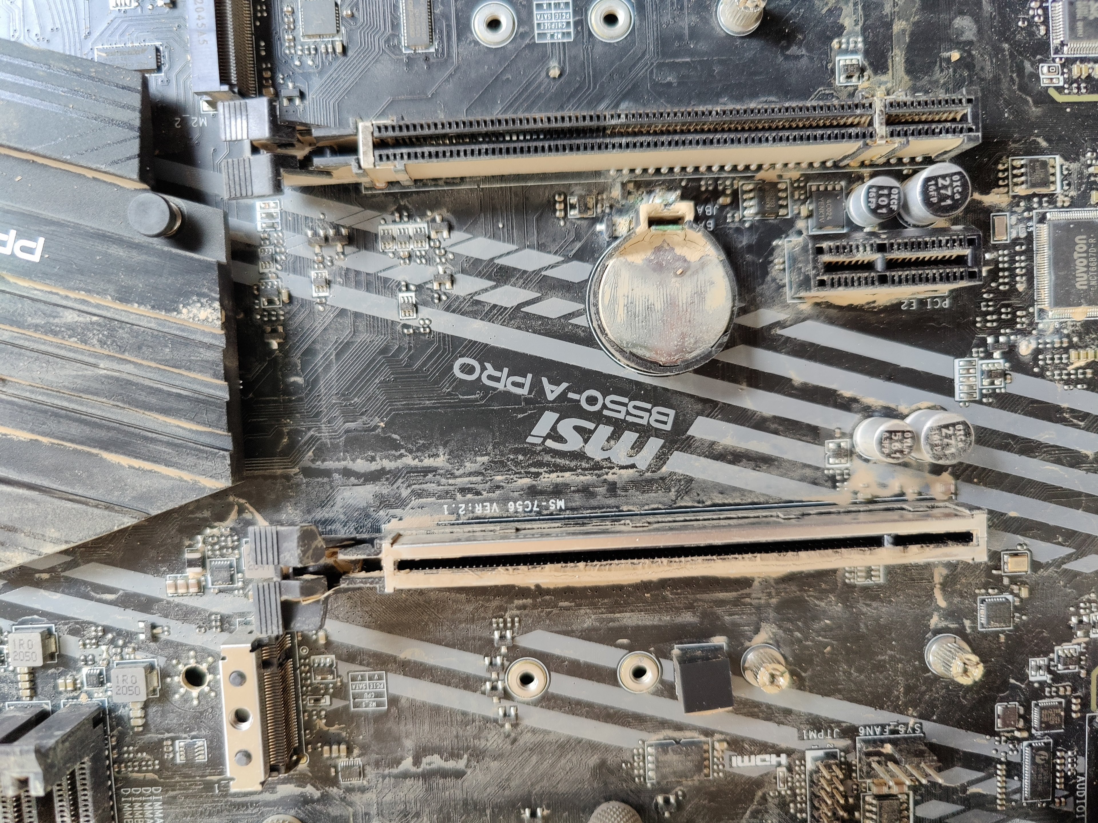 Ich habe die Sachen soweit ausgebaut und würde es dir wie unten beschrieben zuschicken. Den sperrigen Lüfter schicke ich nicht mit. Der Matsch hat sich gut ins Mainboard gesetzt, ich bin gespannt, was du rausholen kannst. Wenn du es nicht hinbekommst, kein Problem. Der Thread hier wird auf einmal sehr populär und alle Scheinwerfer werden bald auf dich gerichtet sein. Aber kein Stress, was hinüber ist, ist hinüber. Ist eh ein Wunder, wenn etwas davon noch funktioniert. Der PC war mehr als 2 Stunden komplett unter Wasser.