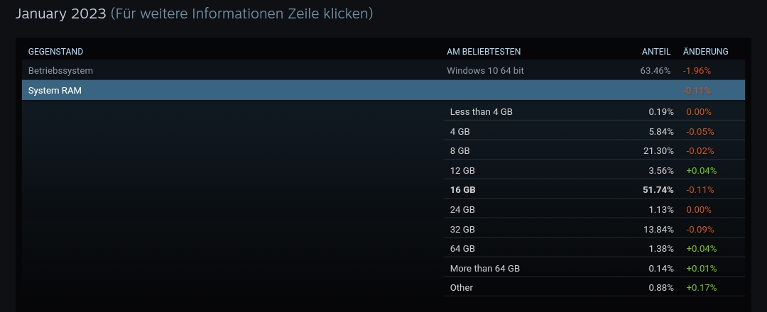 Und wenn man da mal den Filter setzt, dann sind hier definitiv 32 GB RAM längst nicht bei den 13 %, sondern eher bei 30-40%. Das sieht man hier auch an den Signaturen.