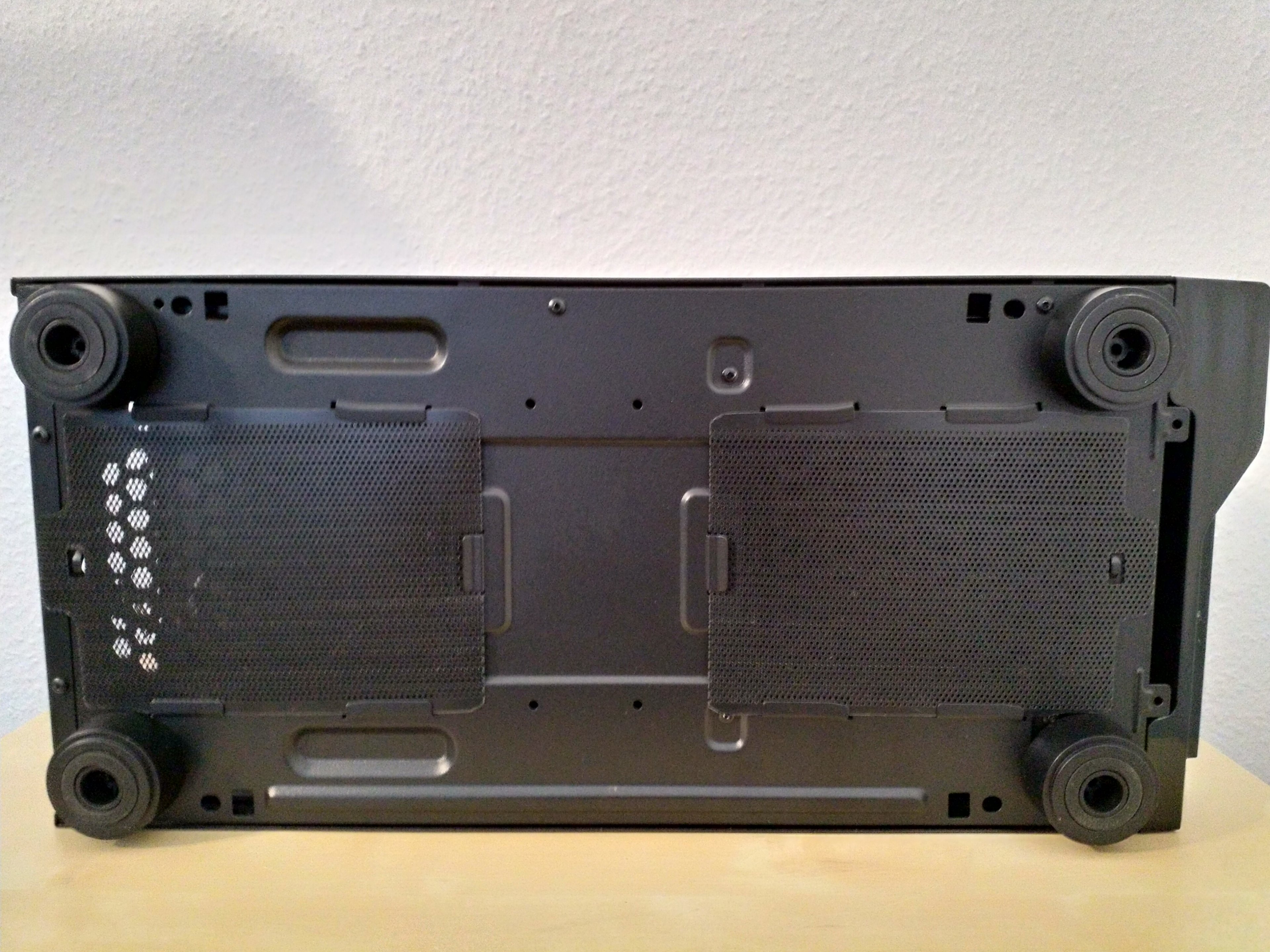 An der Unterseite wurden zwei Staubfilter aus Mesh-Gitter angebracht. Die Gitter besitzen an den Rändern eine Auszugslasche und etwas dickeres Material. Dadurch lassen sich die Filter nach hinten bzw. nach vorne ausziehen. Da dieser Prozess aber immer noch recht schwerfällig ist, muss das Gehäuse bei der Reinigung der Staubfilter definitiv auf den Kopf oder die Seite gelegt werden. Damit das Netzteil auch genügend Luft bekommt, steht das Gehäuse auf vier Kunststoff-Füßen mit einer Schicht Gummi zur Entkopplung. Die Füße wirken stabil uns lassen das Gehäuse sicher stehen.