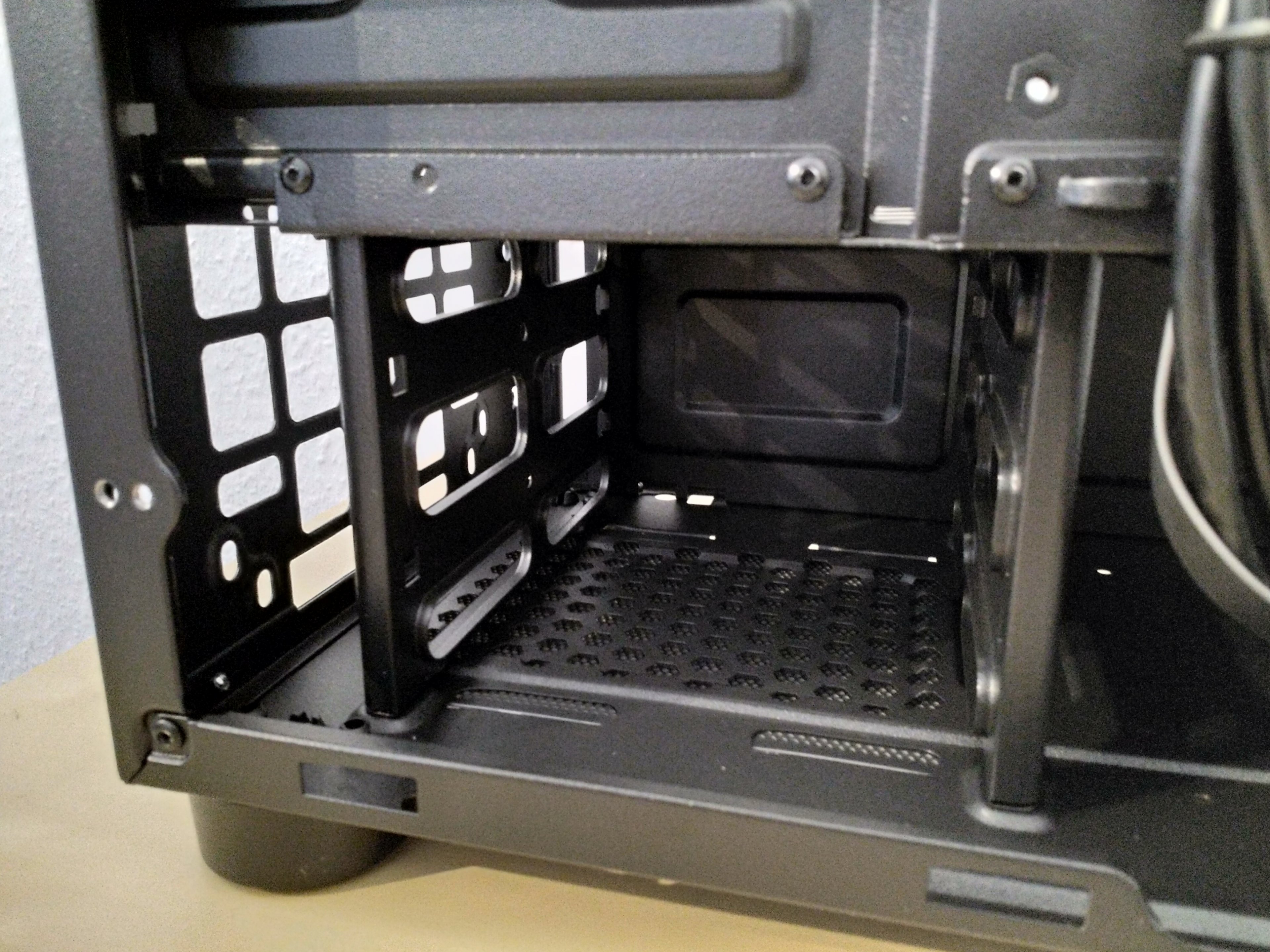 Zur Befestigung des externen 5,25"-Laufwerks sind ein Schraubendreher und Schrauben notwendig. Auf der Rückseite und versteckt unter der Netzteilabdeckung befindet sich ein Festplattenkäfig für zwei 2,5“/3,5“-Festplatten. Die verwendeten Rahmen sind aus Kunststoff, dienen zur werkzeuglosen Montage (nur für 3,5“) und besitzen keine Entkopplung. Über dem eigentlichen Laufwerkskäfig hat Chieftec noch zwei weitere Montagemöglichkeiten für 2,5“-Datenspeicher angebracht. Auch hier erfolgt die Befestigung ohne Werkzeug.