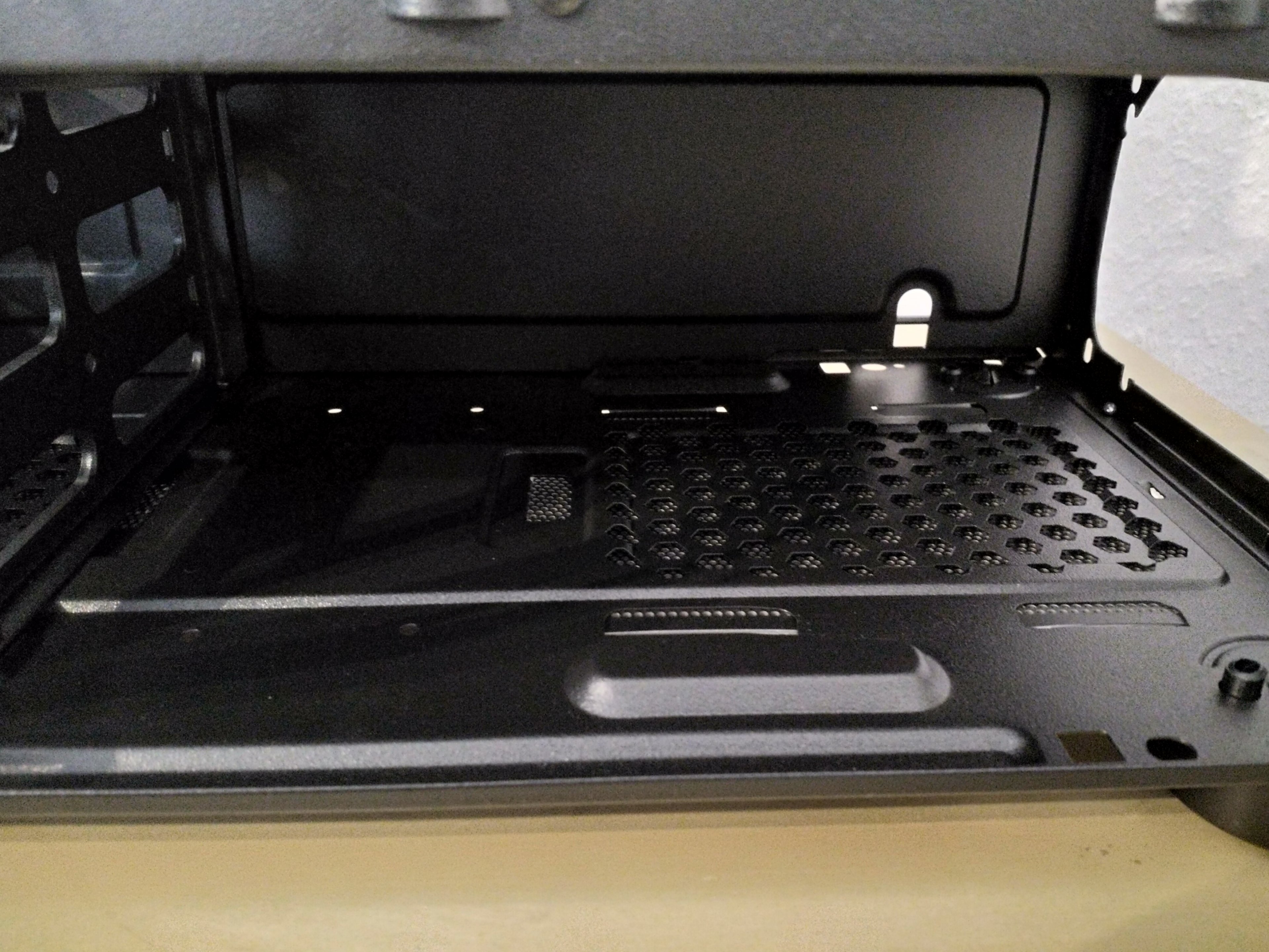 Wie bereits erwähnt ist das Falcon-Gehäuse ist im Inneren sehr offen gestaltet. Hinter den Frontlüftern befinden sich keine Käfige sodass die Lüfter die Luft ungehindert in den Innenraum befördern können. Im unteren Bereich hat Chieftec eine schlichte Netzteilabdeckung angebracht. Diese deckt den kompletten unteren Bereich ab. Außerdem verfügt die Blende über eine große gummierte Öffnung für Kabel und Belüftungsöffnungen oberhalb des Festplattenkäfigs. Rund um die Montagefläche des Mainboards befinden sich weitere, ausreichend dimensionierte Kabeldurchführungen. Diese Durchführungen besitzen teilweise stabile Gummierungen. Das Mainboardtray wurde zudem mit einem sehr großen Ausschnitt für die CPU-Kühler-Montage ausgestattet.