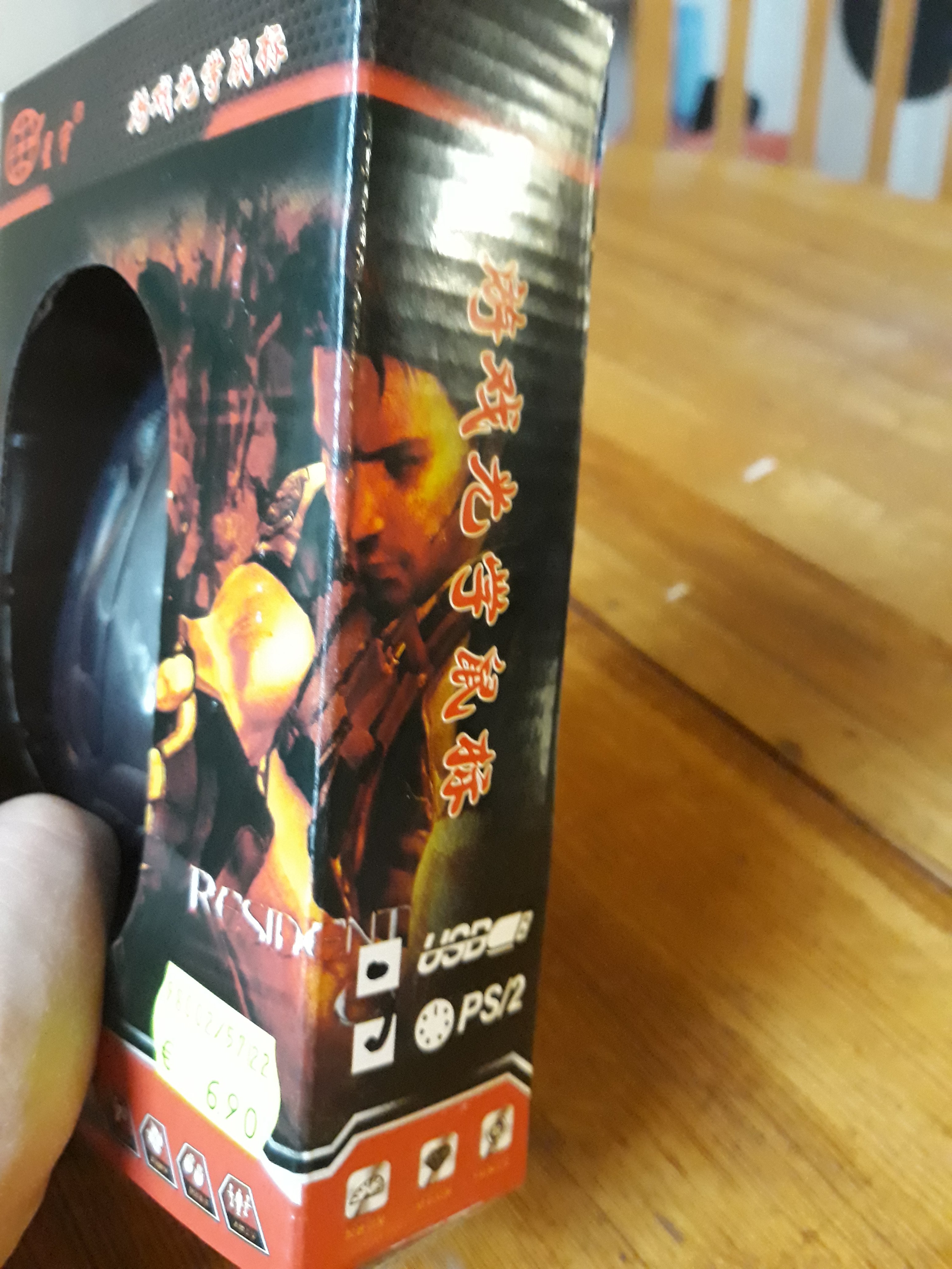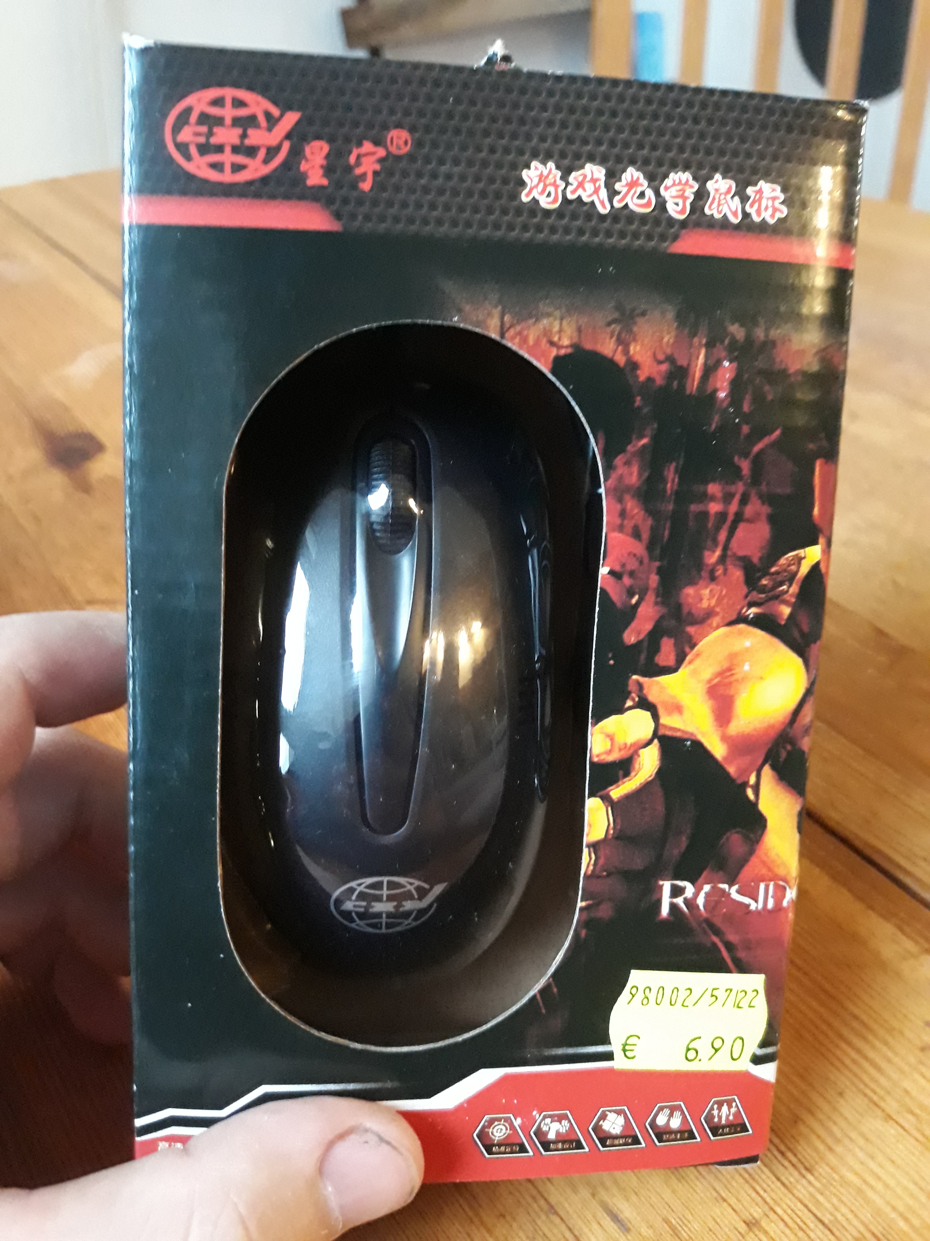 Gleich zu Begin fällt einem die Wertigkeit des Pappkartons auf, durch die geschickte Anordnung von Pappe und Plastik kann man sofort einen Blick auf die revolutionär gut aussehende Maus erhaschen. Fast ausschließlich Chinesische Schriftzeichnen lassen ahnen, dass diese Maus auf dem deutschen Markt eine absolute Rarität ist. Der markige Polygonkopf neben der Maus springt geradezu ins Auge. Der "Resident Ev"schriftzug zeigt, dass bei cxy gewiefte Leute sitzen die sich nicht zu schade dafür sind für 1 nices Design tief in Copyrightgrauzonen vorzudringen.