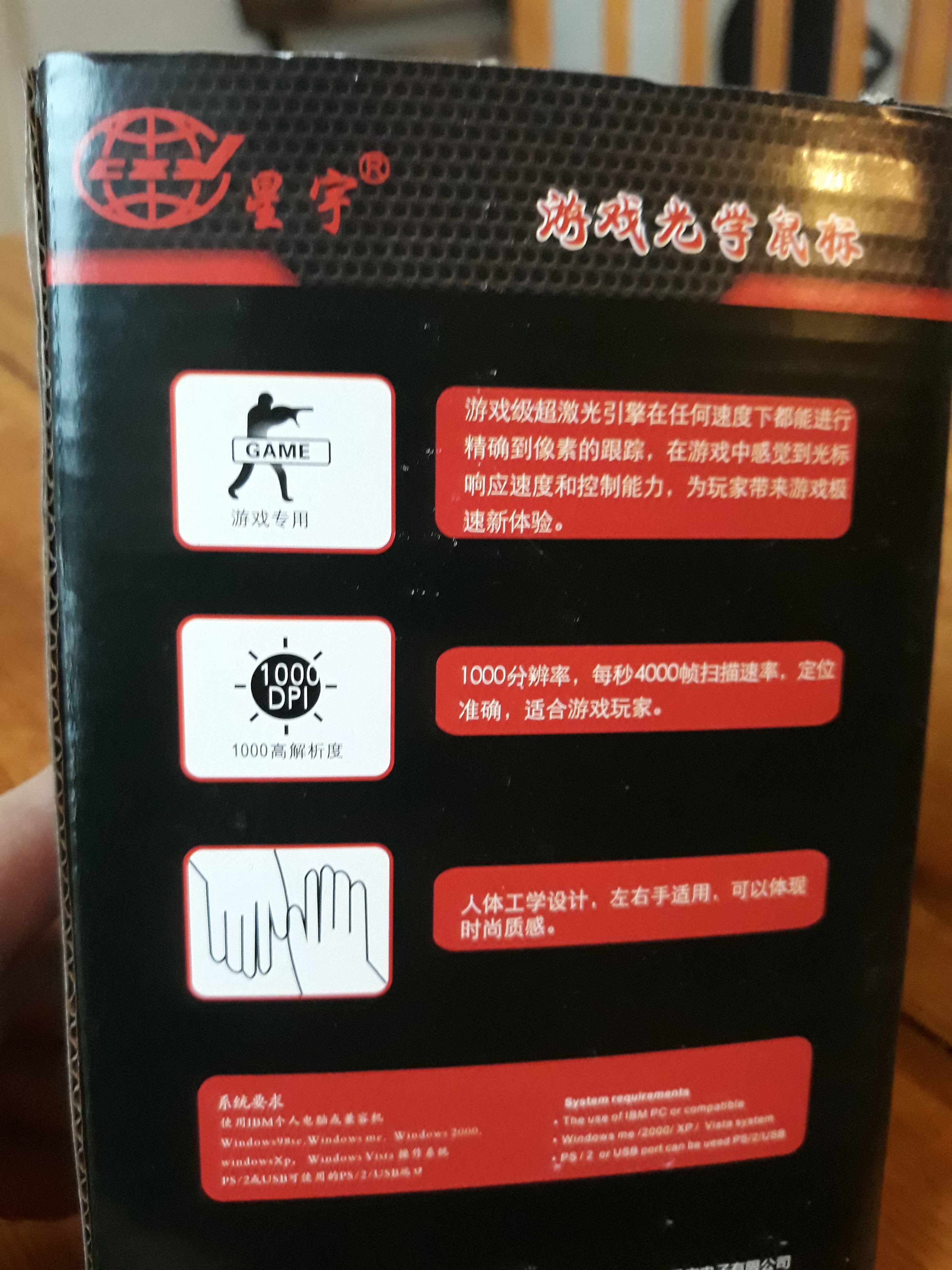 Die Kartonagenrückseite offenbart warum es sich hier um eine hochkarätige Maus der Spitzenklasse handelt. Ob Logitech, Razer oder wie sie alle heißen, keine andere Maus kann die "GAME" Technologie für sich beanspruchen. Solide 1000 Dpi sind nicht von schlechten Eltern und sogar du kannst, mit deinen verschieden dicken Wurstfingern die Maus anpacken wie du willst.