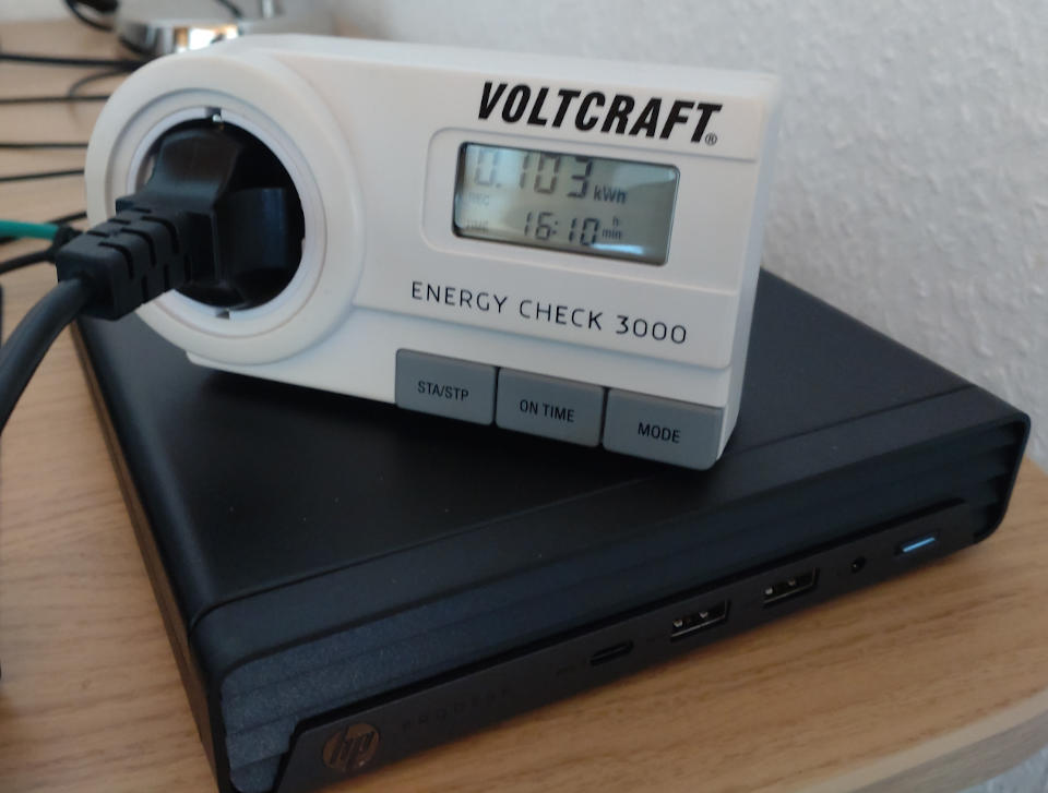 Einer der Gründe für den Kauf war ein niedriger Stromverbrauch trotz aktzeptabler CPU Leistung, falls ich den PC mal etwas länger als Server betreiben möchte. Für die Messung des Stromverbrauchs habe ich ein externes Messgerät verwendet.