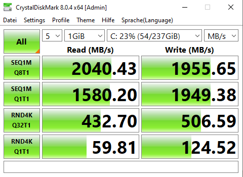 Als NVMe Festplatte kommt eine "SK hynix BC711 HFM256GD3JX013N" mit 256 GB zum Einsatz. Beim Lesen und Schreiben schafft sie ca. 2000 MB/s.