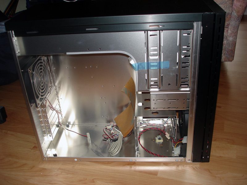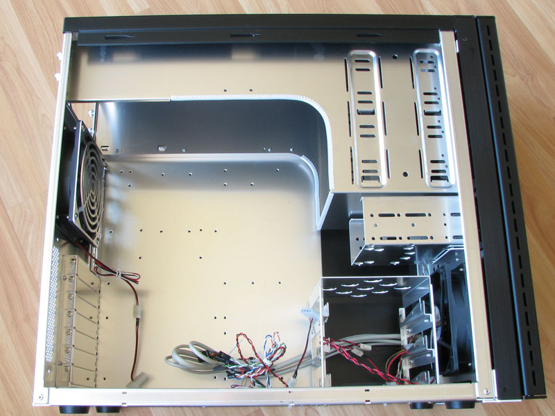 Der hohe Qualitätseindruck setzt sich im Innenraum fort. Scharfe Kanten oder Ecken sgibt es nicht. Selbst die Abgerundeten Kanten im Inneren wurden zusätzlich mit einer Plastikschiene versehen. Der Innenraum ist sehr überlegt gestaltet, der Festplattenkäfig lässt sich um 90° drehen.