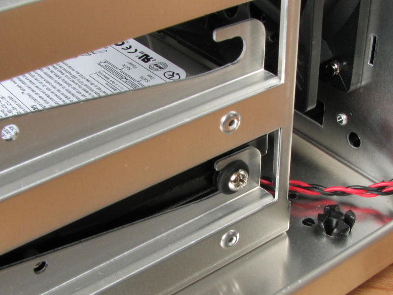 Das Netzteil selbst wird zunächst mit der abnehmbaren Blende verschraubt um es dann anschließend in das Gehäuse zu schieben. Abschließend wird die Blende mit 4 Thumb-Screws arretiert.