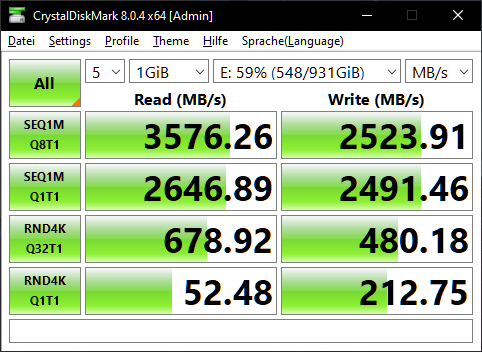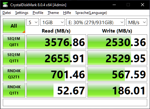 Auch wenn die Tests zum Datendurchsatz keine perfekten Laborbedingungen erfüllen (verschieden belegte Kapazität durch Windows Neuinstallation, Backups ect), lässt sich erkennen, dass die Geschwindigkeit der PCIe 3.0 SSD, wenig verwunderlich, voll ausgereizt wird. Bei der PCIe 4.0 SSD ist noch ein klein wenig Luft nach oben, laut Herstellerangaben soll sie 7000MB/s lesend und 5000MB/s schreibend erreichen, nur denke ich nicht, dass es hier an dem Mainboard, viel mehr bei Abweichungen der SSD liegt.