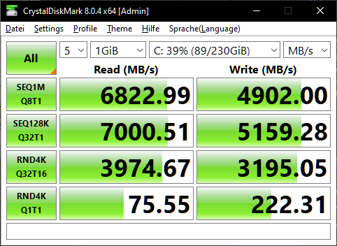 Auch wenn die Tests zum Datendurchsatz keine perfekten Laborbedingungen erfüllen (verschieden belegte Kapazität durch Windows Neuinstallation, Backups ect), lässt sich erkennen, dass die Geschwindigkeit der PCIe 3.0 SSD, wenig verwunderlich, voll ausgereizt wird. Bei der PCIe 4.0 SSD ist noch ein klein wenig Luft nach oben, laut Herstellerangaben soll sie 7000MB/s lesend und 5000MB/s schreibend erreichen, nur denke ich nicht, dass es hier an dem Mainboard, viel mehr bei Abweichungen der SSD liegt.