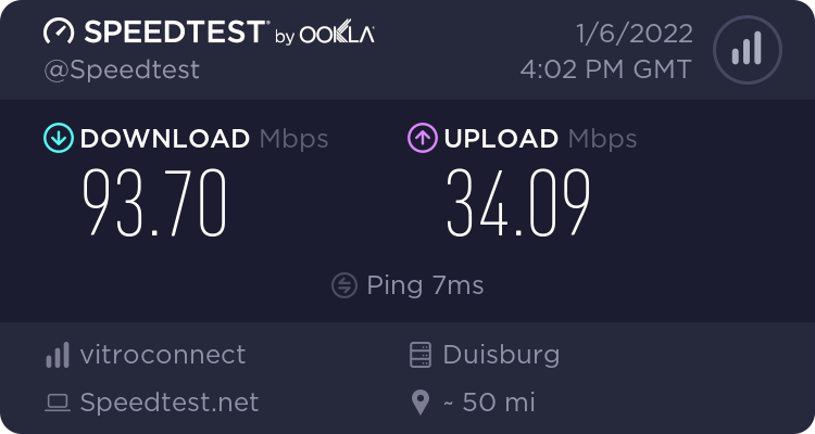 Hier dazu noch ein Ergebnis von speedtest.net, mein ISP liefert 100Mbit/s wovon ~93Mbit/s real ankommen.