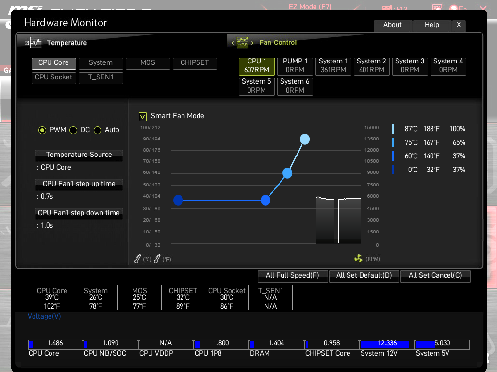 Ansonsten möchte ich noch die Lüftersteuerung vom MSI BIOS hervorheben, ich werde an dieser Stelle keine Hersteller nennen die mir missfallen, jedoch gefällt mir die Art und Weise der Umsetzung bei MSI einfach am besten und lässt mich problemlos alles nach meinen Wünschen einstellen.