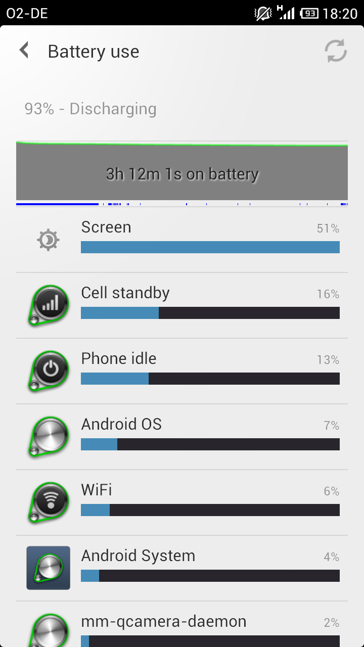 Ich verlier 7% in guten 3 Stunden, Screen war ca. 14min an, in der Zeit war ich nur kurz in whatsapp, hab ein Foto geschossen, und 1min ein Lied angehört. Ansonsten hatte ich alle autostarts deaktiviert, es lief nichts anderes im Hintergrund, was noch zusätzlich akku ziehen könnte.