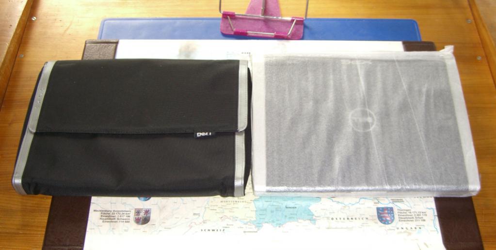 Notebooktasche macht einen qualitativ hochwertigen Eindruck, Verschluss funktioniert magnetisch. In der Tasche dann schließlich das XPS M1530, nochmal eingewickelt in sone Schaumstoffhülle.