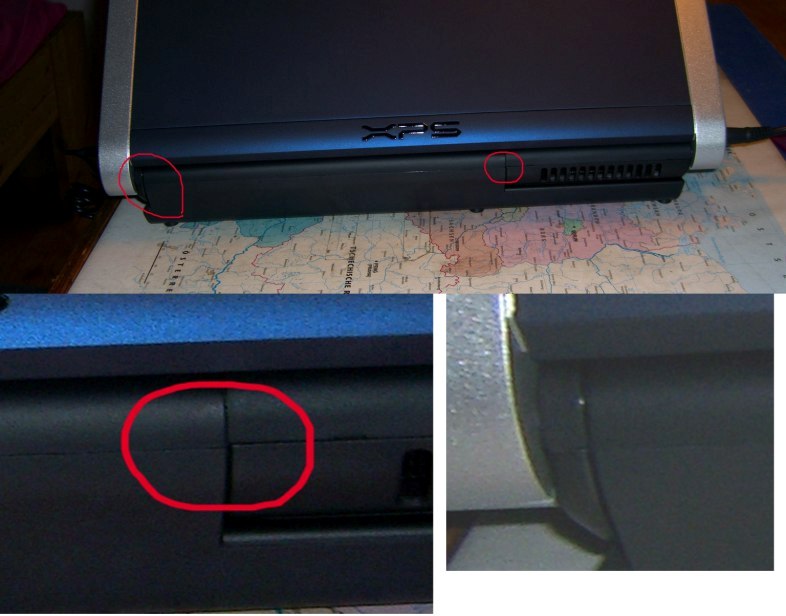 Das XPS M1530 macht von der Haptik her einen sehr hochwertigen Eindruck, die Verarbeitung ist durchgängig sehr gut. Das gesamte Gehäuse wirkt sehr stabil, es knarzt nichts und auch das Display ist fest im NB verankert. Die einzige bisher entdeckte Schwachstelle ist, dass der Akku nicht zu 100% mit dem Gehäuse abschließt und dabei meine ich nicht dass er an der Unterseite des Books absteht sondern dass die Befestigung in Displaynähe eine leichte Ungenauigkeit aufweißt, sodass der Akku an der einen Seite (links) etwa einen Millimeter an der Notebookrückseite herausragt und nicht exakt die Trennlinie an der Gehäuserückseite zwischen oberem Teil und unterem Teil fortführt (siehe Bilder).