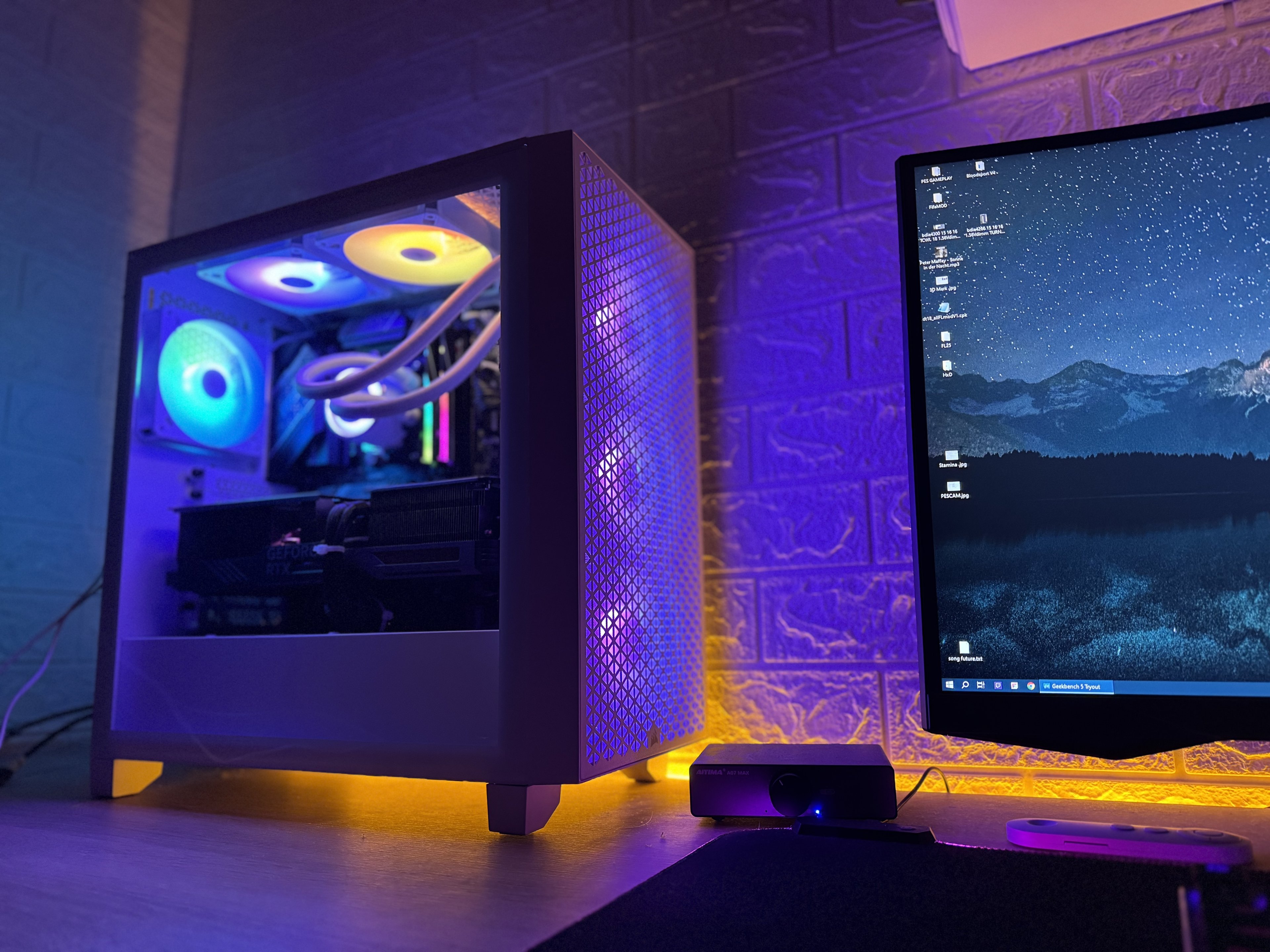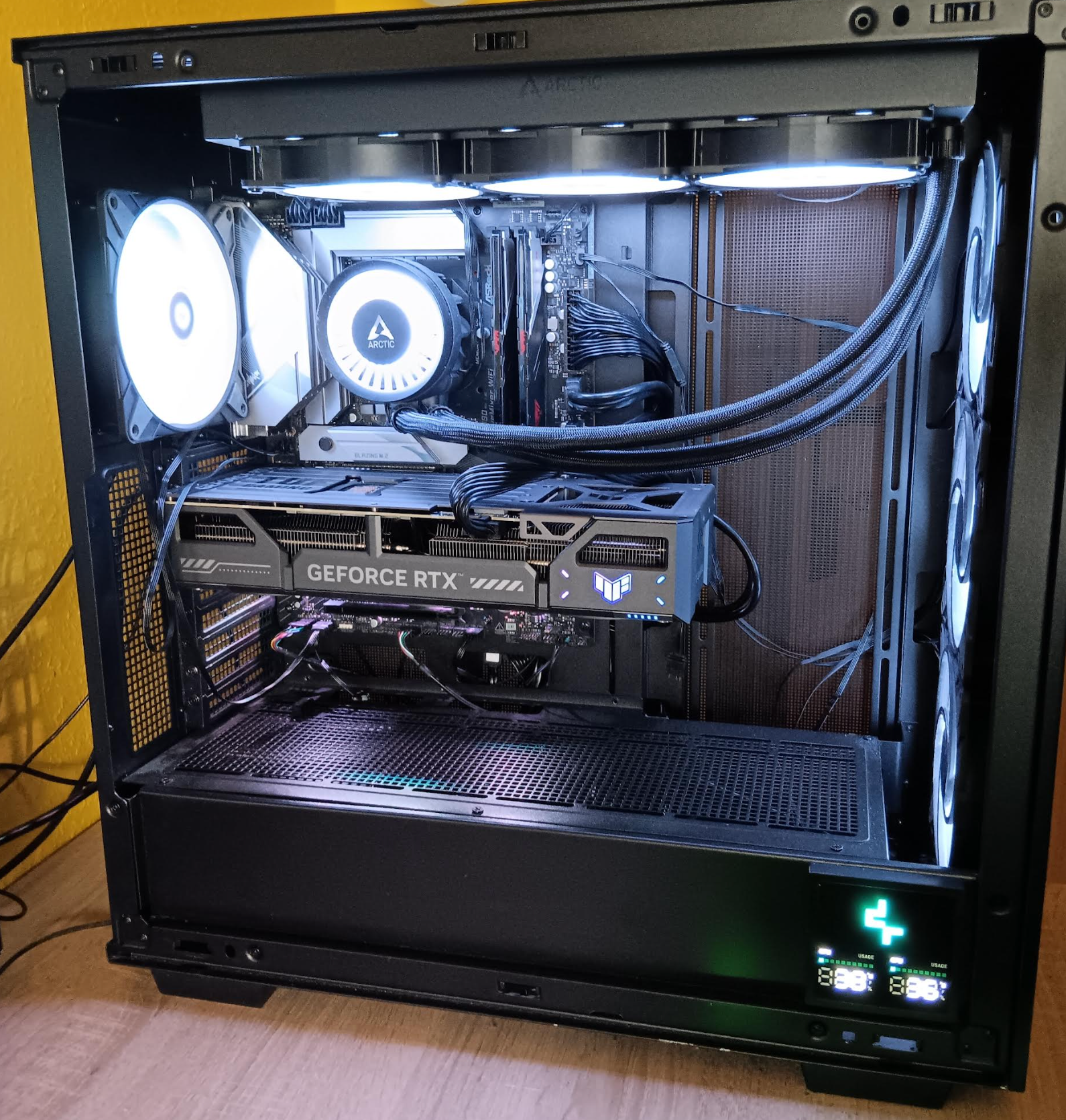 Bei mir war der PC immer Dunkel, schön mit Noctua Hardware, zwar Seitenscheibe aber Dunkel. Nach meinem Grafikkarten Wechsel auf Sapphire, fing ich an die Beleuchtung zu mögen. Nun liebe ich mein Aquarium PC, dezent beleuchtet im Warmweißen Licht. Es leuchtet das MB, AIO ( Vorher Noctua Luftkühler ), Graka und der Ram. Dazu das Fractal Design North und die übrigen Noctua Lüfter. Ich bin begeistert ( so soll es auch sein )