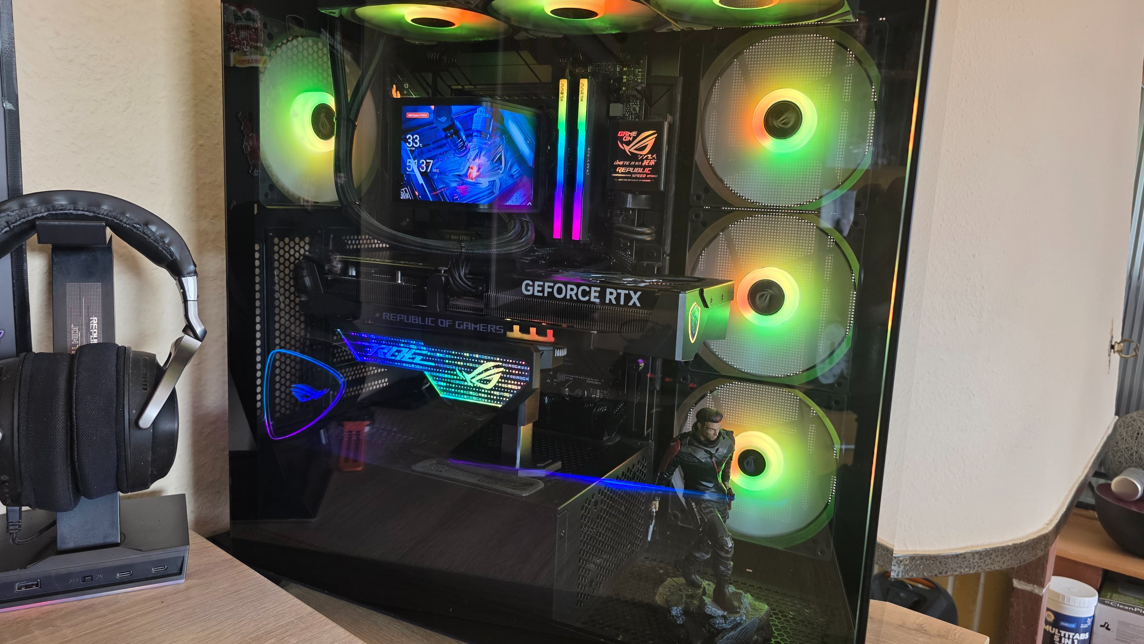 Jedenfalls leuchten Gehäuse und ein LED-Stripe wandernd bunt, der Schreibtisch hat auch einen Stripe, und Tastatur und Maus leuchten auch leicht.