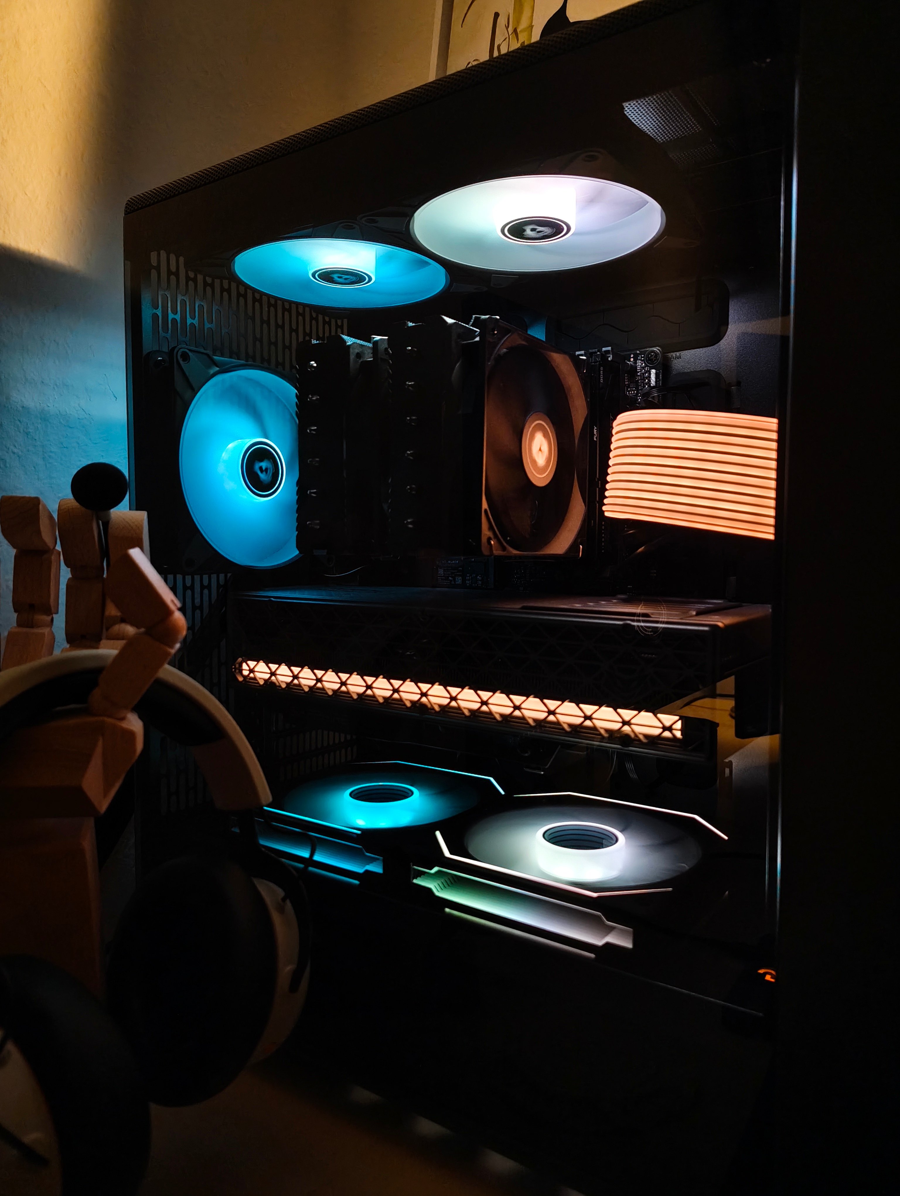 GPU Block von Alphacool hat RGB und mein X870E E Gaming hat am IO Panel auch das ROG Logo als RGB Ausführung. Ansonsten nichts. RAM ist mit Wakü (POM) und CPU Kühler ist der Core1 ohne RGB.