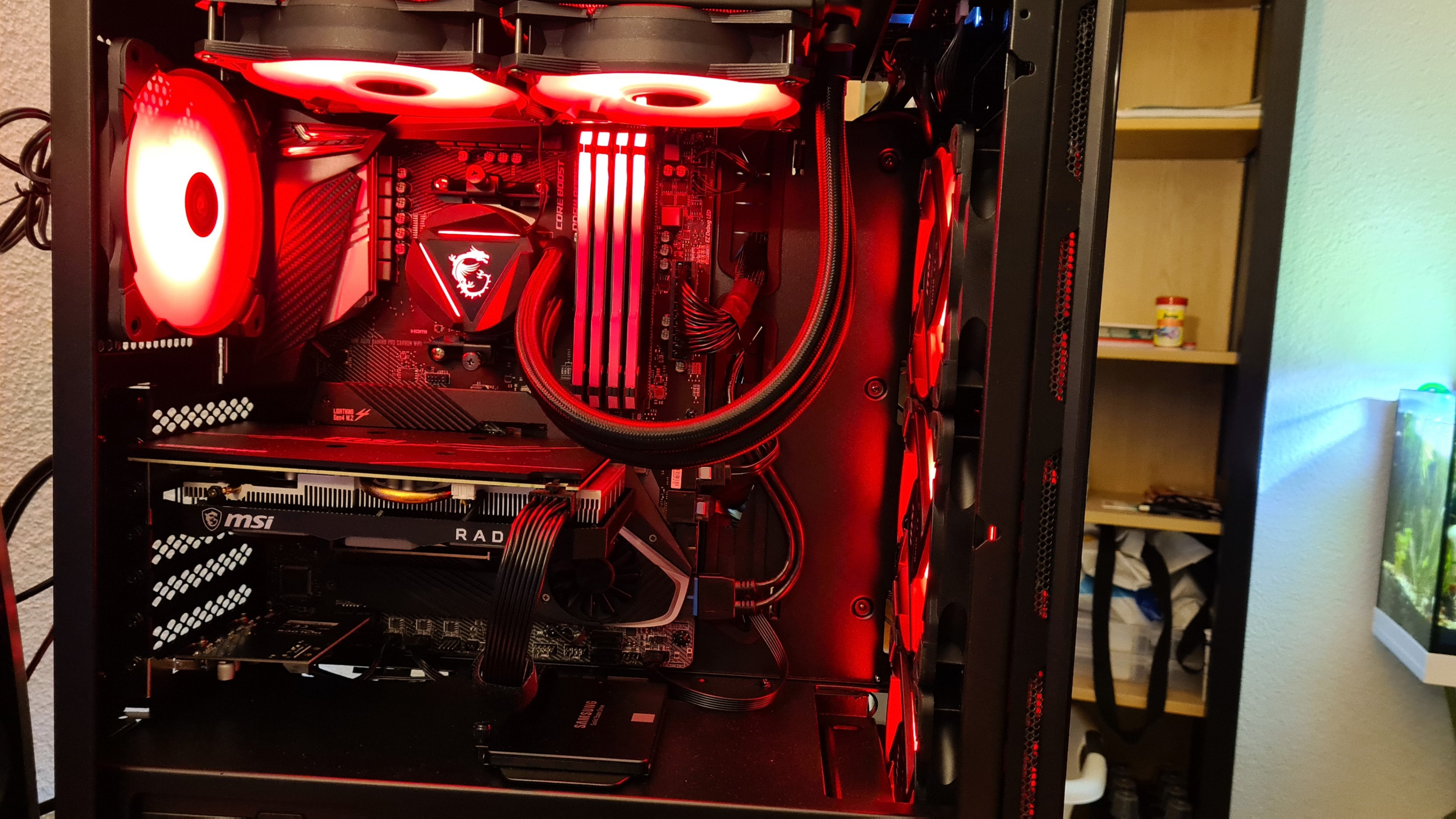Mit dem RGB-Knopf des Gehäuses steuere ich die 4 vorinstallierten MSI Lüfter sowie die Wasserkühlung.