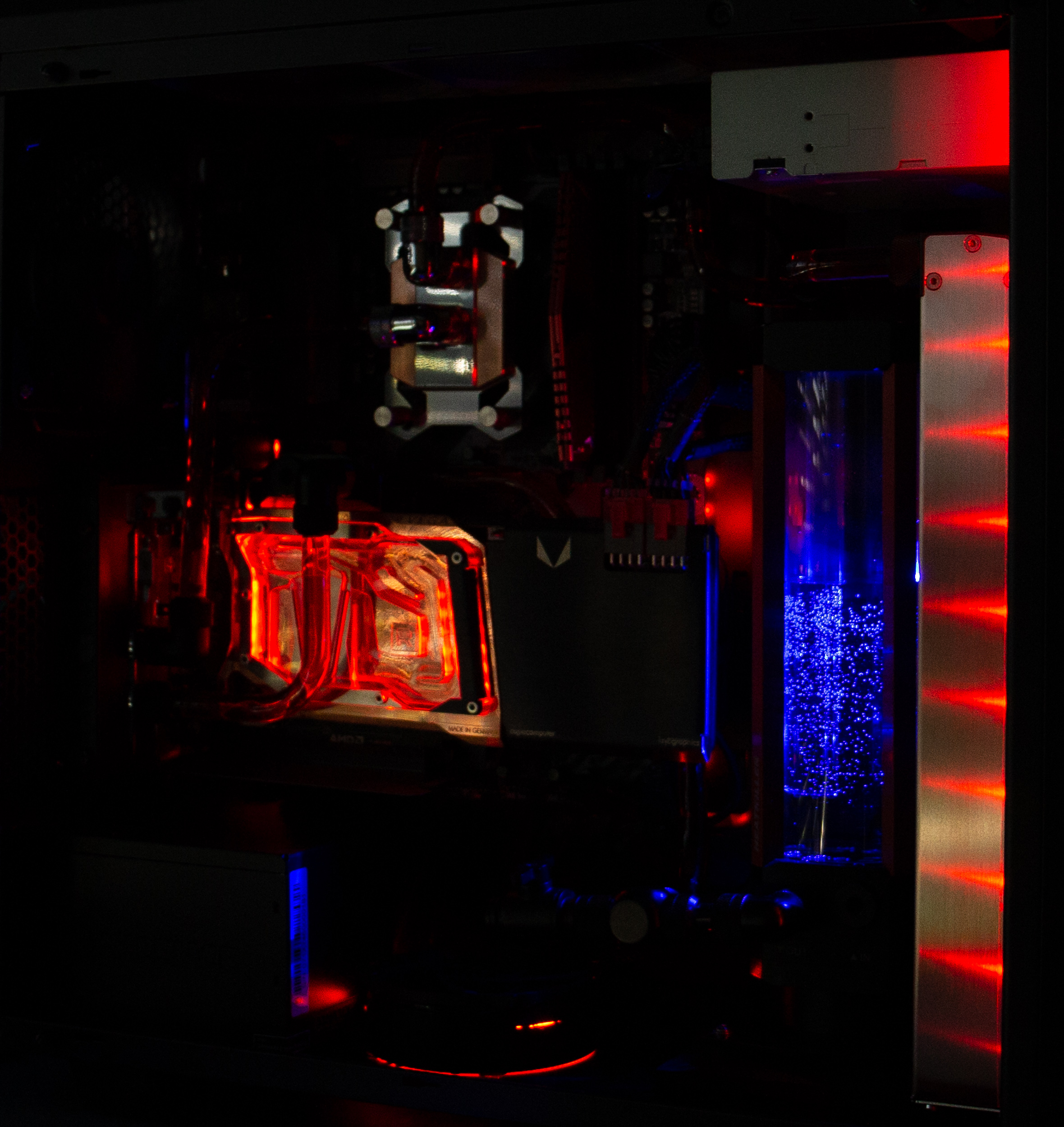Ich habe meine RGB-Beleuchtung komplett manuell durchgezogen. Krönung des Ganzen war meine Weigerung, für die Heatkiller Tube einen LED-Streifen zu kaufen, da ich noch RGB-Streifen am Meter da hatte. Also habe ich die grüne Leiterbahn abgeschnitten, damit der Streifen passte (es sollte nur Blau leuchten) und habe den Streifen an einen Lüfteranschluss per 3-Pin angeschlossen. Das größte Problem dabei war, das Plastik vom 3-Pin so zurechtzuschneiden, dass es in die dünne Führung von der Heatkiller Tube passte. Die Helligkeit kann ich jetzt im BIOS durch Änderung der Spannung einstellen.