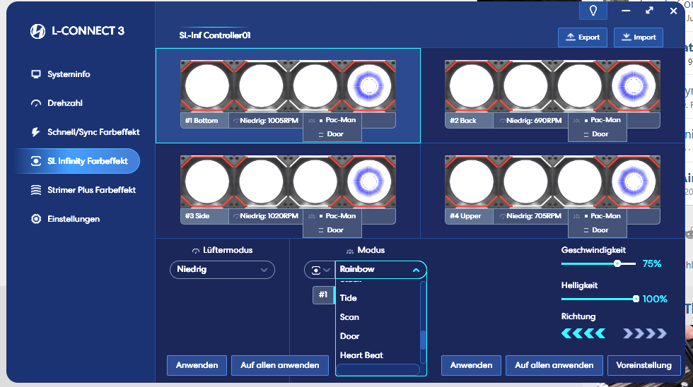 Was ich meine: Ich habe 4 Kanäle voll mit 3 Lüftern jeweil. Also oben, seite, unten und hinten. Die Farbe sollte von Oben links anfangen dan den ganzen verlauf machen nach rechts, dann nach unten, dann wieder nach links und wieder zurück.