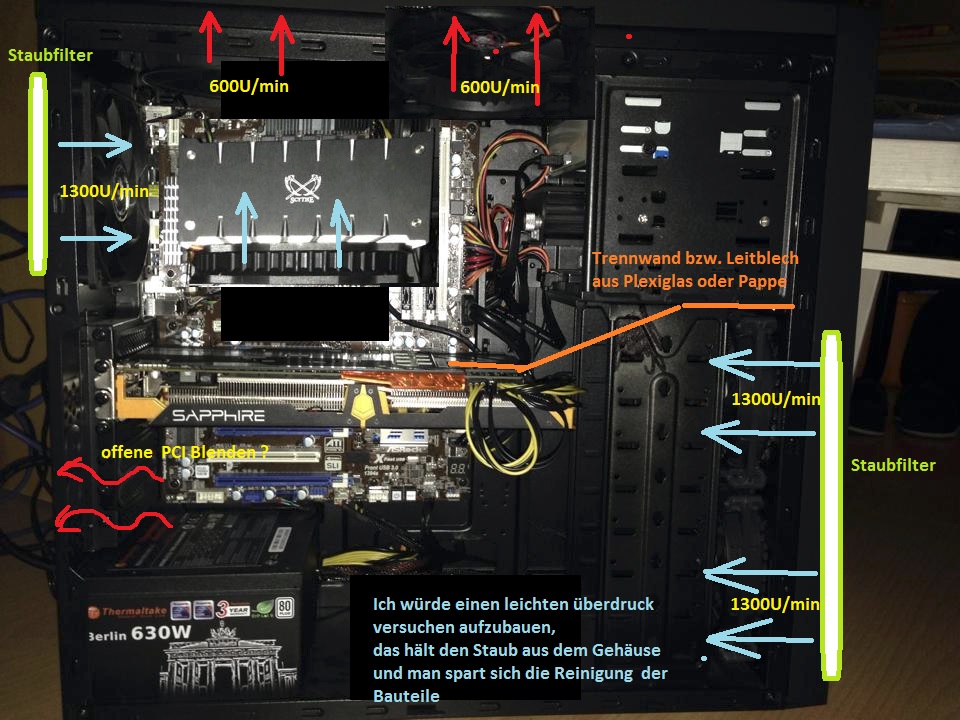 Mein Airflow ist ähnlich wie deiner, ich habe eben noch meine Strömungsverhältnisse optimiert, meinem System ist es fast Wurst wie schnell die Gehäuselüfter arbeiten. Bei min. (~500RPM) komme meine GraKa 1°C höher wie bei max. (~1000RPM) unter Furmark.