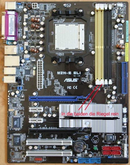 ich hab hier n riesen Problem mit meinem Mainboard (Asus M2N-E SLI). Ich habe hier 2 x 2 GB Kingston HyperX RAM liegen (laut QVL Liste werden die auch ohne Probleme unterstützt). Wenn ich beide Riegel einbaue, passiert nix...der PC fängt nach ner Zeit nur an zu piepen. Kein Videosignal !!! Baue ich nur einen Riegel ein, fährt der PC korrekt hoch. Habe beide Riegel einzeln getestet, sind beide OK.
