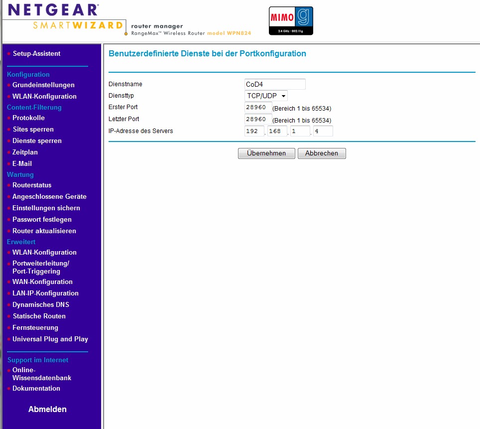 Mein Rechner hat die IP 192.168.1.2. Der Router 192.168.1.1! Es ist ein Netgear WPN824.