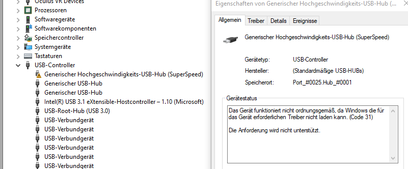 Im Gerätemanager steht auch ein Ausrufezeichen bei "GEnerischer Hochgeschwindigkeits-USB-Hub (Superspeed)
