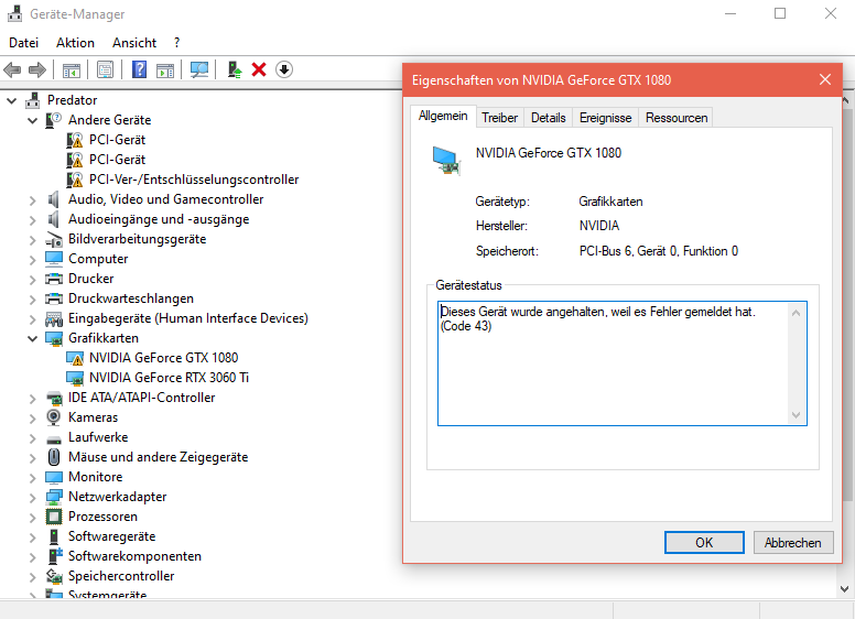 Das Problem ist, dass Windows die Grafikkarte nur so halb erkennt, sie wird im Gerätemanager als GTX 1080 angezeigt, jedoch mit einer Fehlermeldung (siehe Bild). Zudem bekomme ich hin und wieder einen bluescreen vor allem wenn ich den PC herunterfahre/neustarte, was ich aber schon recherchiert habe und das bei anderen auch aufgetreten ist.