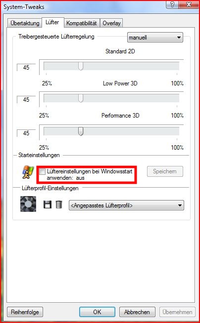 Ich habe Riva Tuner über die Aufgabenplanung den Start zugewiesen. Es klappt auch wunderbar, nur habe ich das Problem wenn ich unter Treibereinstellung -> Systemeinstellung -> Lüfter einstelle das beim Systemstart der Lüfter mit einer eingestellten Drehzahl laufen soll bekomme ich trotzdem beim Start immer die UAC Abfrage für Riva Tuner.