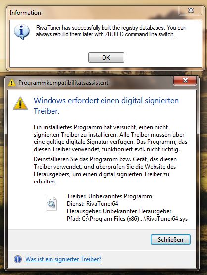 Wenn ich Riva Tuner (neuste Version 2.24) installiere, funktioniert das Programm erstmal wunderbar, nach dem Neustart kommen jedoch Fehlermeldungen, dass der RivaTuner64.sys Treiber nicht gestartet werden konnte (auch "als Admin ausgeführt"), gefolgt von einer Meldung, dass unter Vista 64 die Treibersignatur deaktiviert und neugestartet werden sollte, was aber auch nichts bringt.