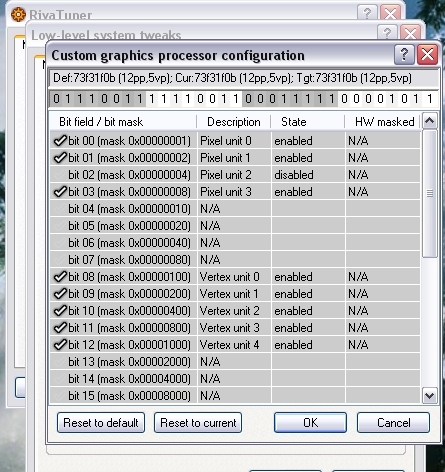 Mich würde jetzt mal interessieren warum RivaTuner bei meiner 7800GS 2 Pixel-Pipelines sowie 2 Vertex-Einheiten anzeigt, die deaktiviert sind und ich sie mit einem Haken versehen kann (aktivieren?) und nix passiert?