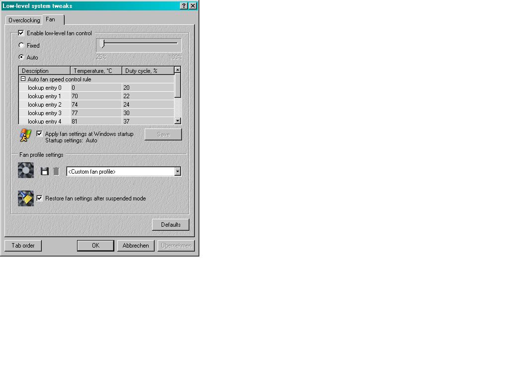 Hi Leute, ich habe mir kürzlich rivatuner drauf gezogen und meine graka übertaktet. dann habe ich gesehen dass es auch noch ein ,,fan''-verzeichnis gibt und hab mal geschaut was man da von der lüftergeschwindigkeit bzw. der temp einstellen kann. jetzt sieht man aber dass bei 70grad gerade mal mit 22% dreht. das ist sehr wenig, normalerweise müsste der da so mit min. 50% drehen (eher 60-70). wie kann man das jetzt einstellen, dass ich die temperatur und drehzahl ändern kann?