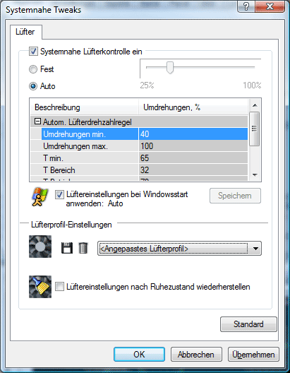 deine Lüftereinstellung steht auf "Auto". Solltest du die Lüfterkontrolle selbst übernehmen wollen, mach den Punkt bei "Fest". Dann kannste per Hand einstellen. Bei mir läufts mit Auto aber anständig.