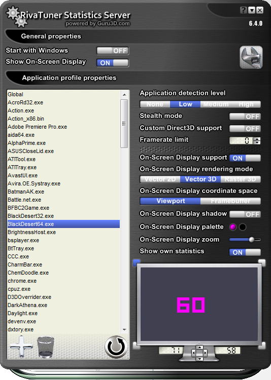 Habe die 32 und 64bit Version von Black Desert eingefügt und die FPS Anzeige vergrößert + in die Mitte gezogen damit nicht evtl. die FPS außerhalb des Bereiches sind.