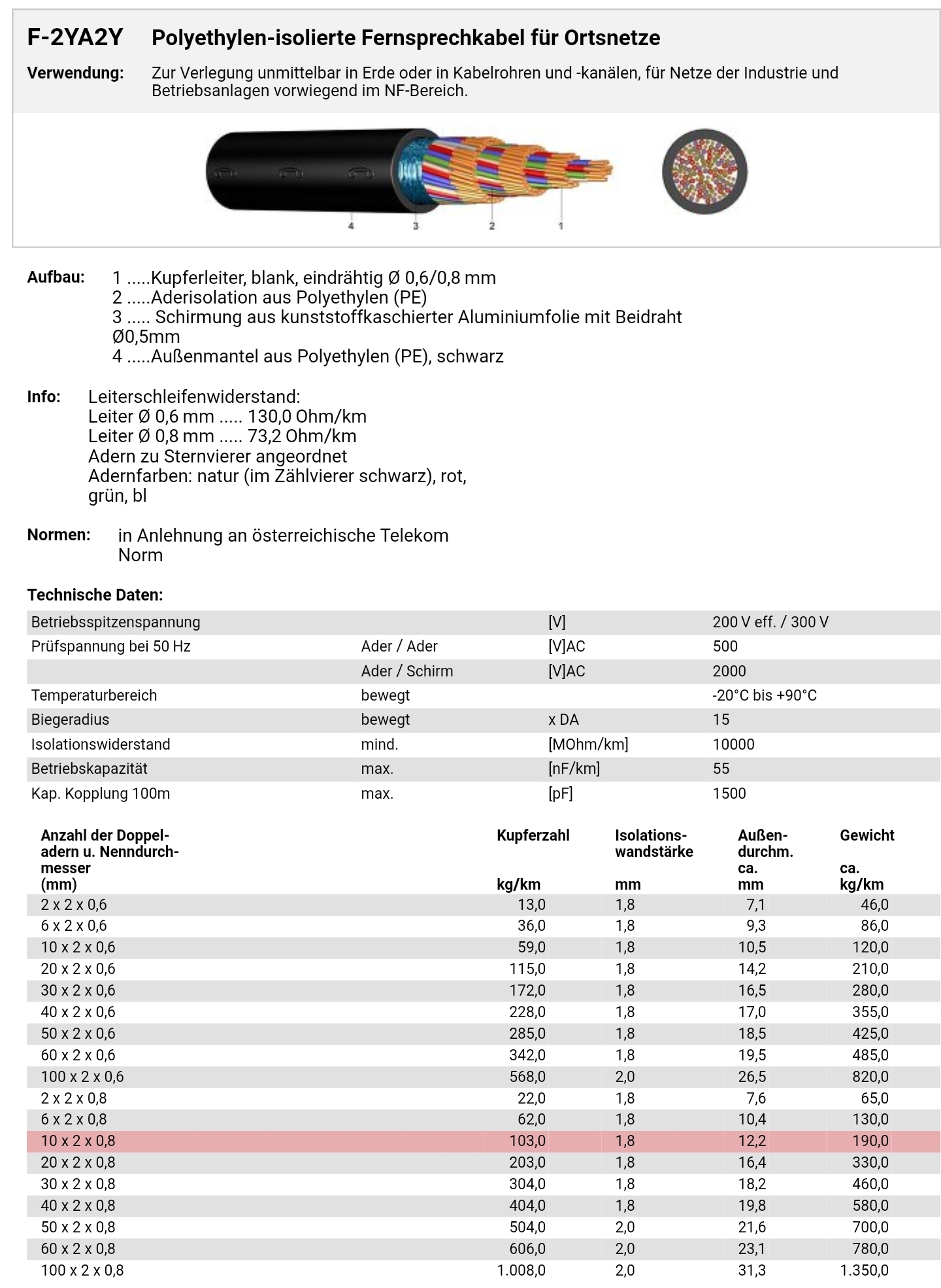 Ich habe vor etlichen Jahren bei einem Garagenneubau ein ca. 40m langes F-2YA2Y Kabel mit 10x Doppeladern á 0,8mm gezogen. Damals rein vorsorglich für Fernsprechanlage, Telefon, Überwachungskamera oder was auch immer…