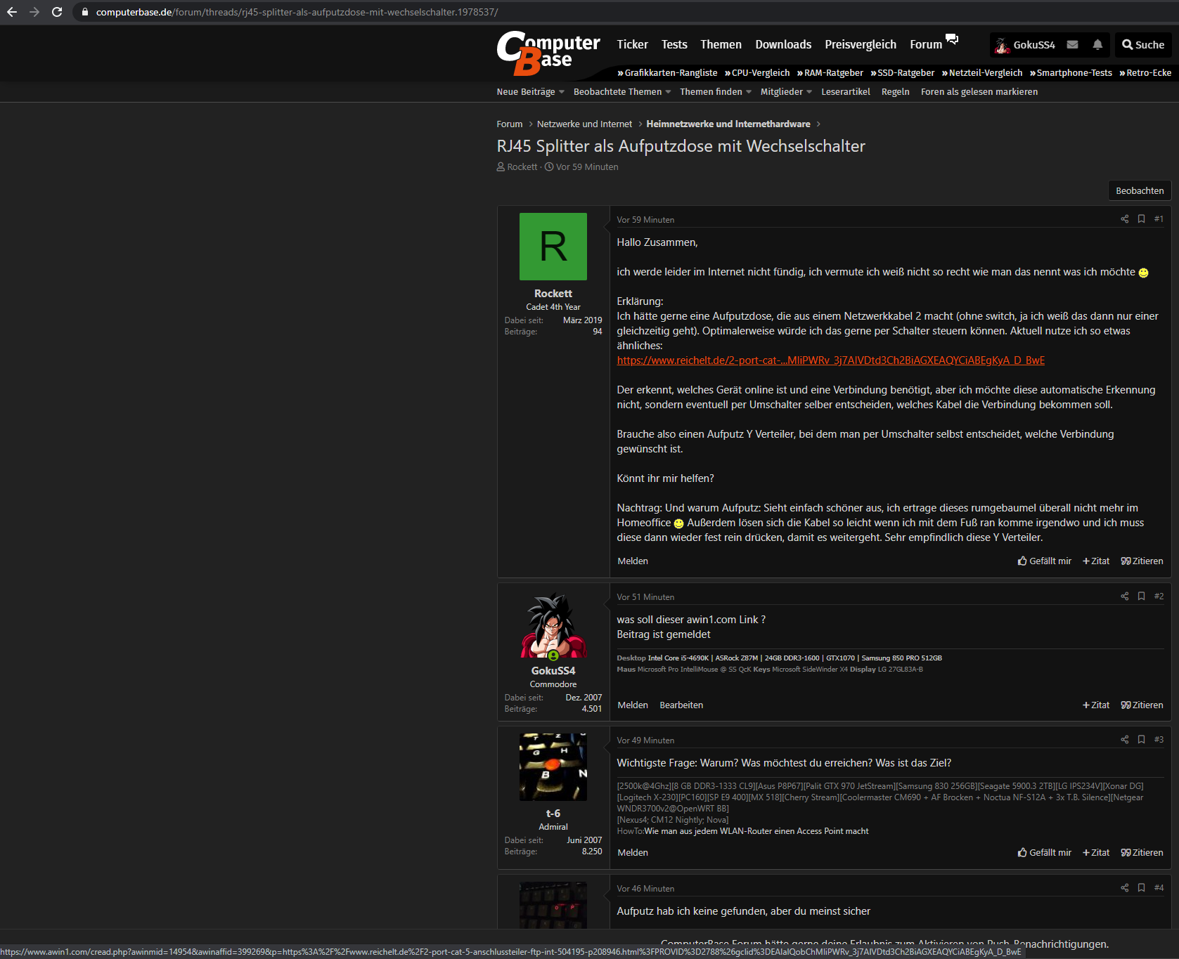 Ich hätte gerne eine Aufputzdose, die aus einem Netzwerkkabel 2 macht (ohne switch, ja ich weiß das dann nur einer gleichzeitig geht). Optimalerweise würde ich das gerne per Schalter steuern können. Aktuell nutze ich so etwas ähnliches: