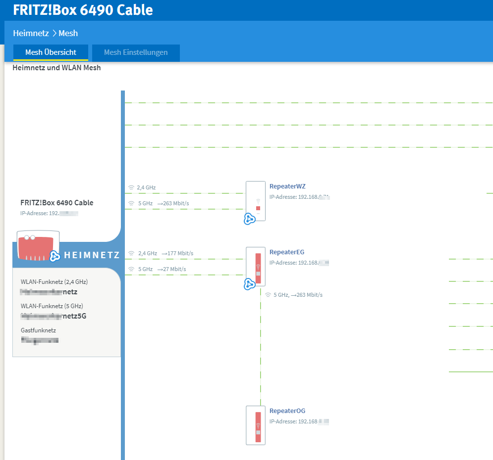 Naja, das Haus hat 3 Stockwerke. Im EG wohnen die Schwiegereltern - im 1. OG wohnen wir. Das 2. OG steht meist leer. Einer der Repeater ist bei den Schwiegereltern im EG. Einer bei uns im Wohnzimer (Fritzbox steht im Arbeitszimmer). Der 3. ist meist nicht in Verwendung.