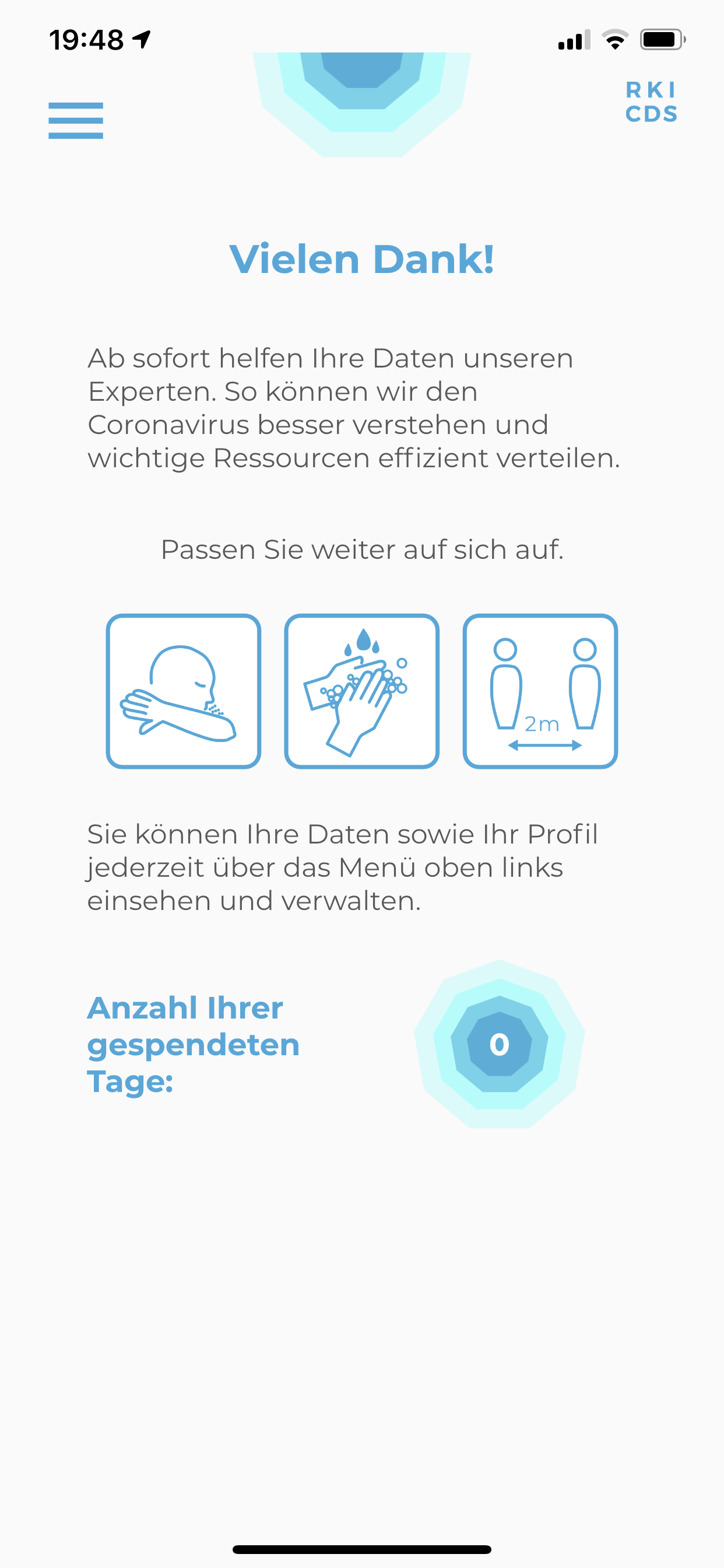 Ich find diese Applikation sehr sinnvoll wenn es helfen kann bestimmte Erkenntnisse zu sammeln was die Art der Infektion mit Corona angeht kann ich das nur empfehlen, aber es ist ja freiwillig darum kann sich auch jeder überlegen ob man mit macht oder nicht außerdem hat Herr Prof. Wieler gesagt dass Ihnen schon eine Datenmenge von 10.000 bis 100.000 genügen würde.