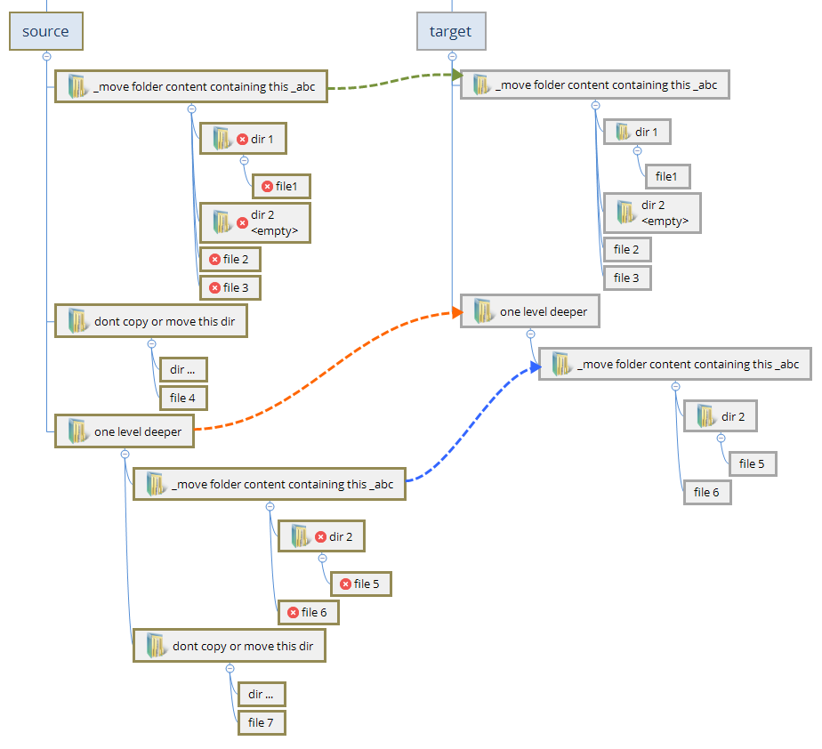 High Level: Dateien und Ordner, die in bestimmten Ordnern liegen (nach Zeichenkette suche) in Quelle sollen nach Ziel verschoben werden. Die Haupt-Ordner in der Quelle selbst sollen dabei erhalten bleiben.
