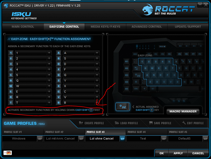 Ich besitze eine Roccat isku und eine Roccat kone xtd und ich möchte die sogenannte Easy Zone für die Isku standardmäßig aktivieren, um den Spielfluss mit Makros zu vereinfachen. Im Optimalfall würde dies auch noch profilspezifisch umschlaten.