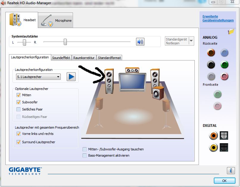 Hey, Vor paar tagen ist mein roccat kave solid angekommen, klappt auch wirklich alles perfekt bin sehr zufrieden aber seit gestern abend muss ich feststellen das ich auf der linken seite (siehe bild - mitn schwarzen pfeil markiert) keinen bass mehr habe bzw es sich leiser anhört. In videos und spielen hör ich einfach mehr auf der rechten seite weil da der bass noch drinn ist bzw es einfach lauter und kräftiger ist. Balance ist von beiden auf 0 bzw 100 also daran liegts nicht, & ja ich habe schon rumgefummelt mit bass managment etc, & die hinteren boxen funktionieren auch super mit sound nur halt die front/stereo linke box geht nicht bzw hat kein bass/kräftigen sound. Kann mir da jemand weiterhelfen?