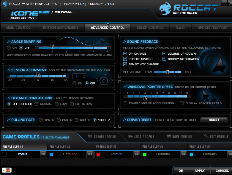 Hallo! Ich hab aufgrund einer Empfehlung hier eine Roccat Maus gekauft. Leider ruckelt sie auf dem Tisch, der hellbraun ist, hab jetzt ein paar Untergründe probiert es ruckelt fast überall, außer auf einem hellgrauen Pappkarton, da geht es. Hab mehrere Mäuse probiert, die funktionieren eigentlich alle beim hellbraunen Tischhintergrund. Im Forum hier hab ich dazu gefunden, dass man eine Distancecontroll auf 0 setzen soll. Ich konnte aber eine Distancecontroll nicht finden. Habt ihr eine Idee? Muss ich jetzt ein Pad kaufen?