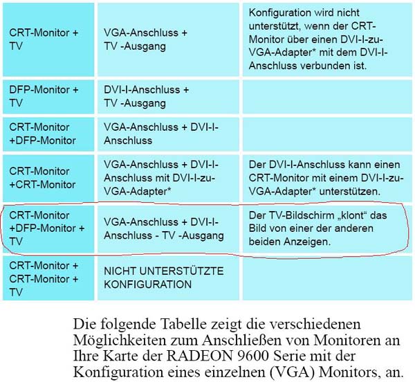 ich habe eine Sapphire 9600 und habe dort einen CRT- und TFT Monitor angeschlossen. Zusätzlich noch über den TVout einen Fernseher.
