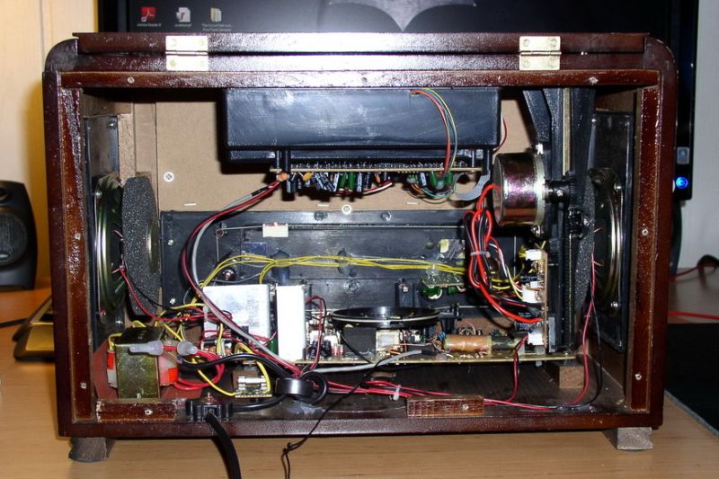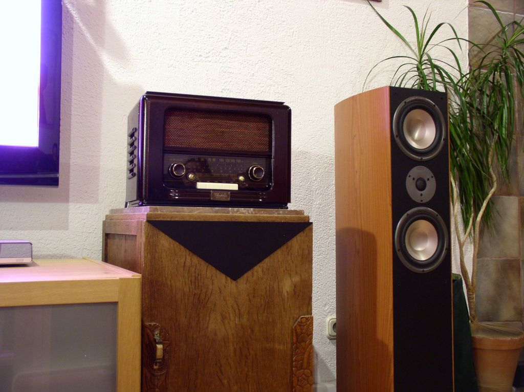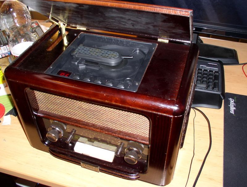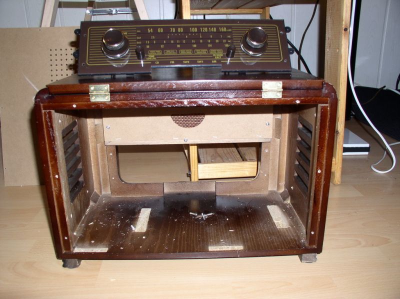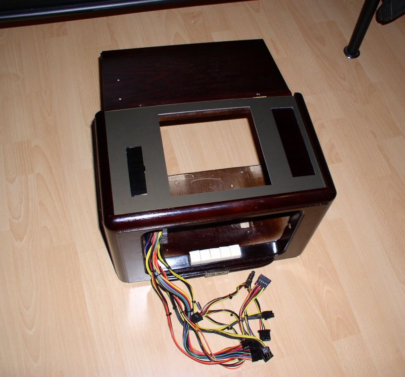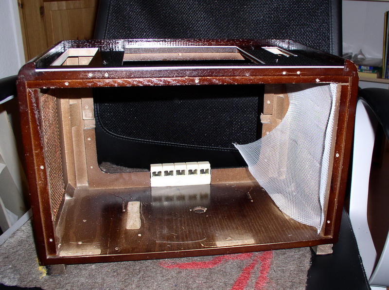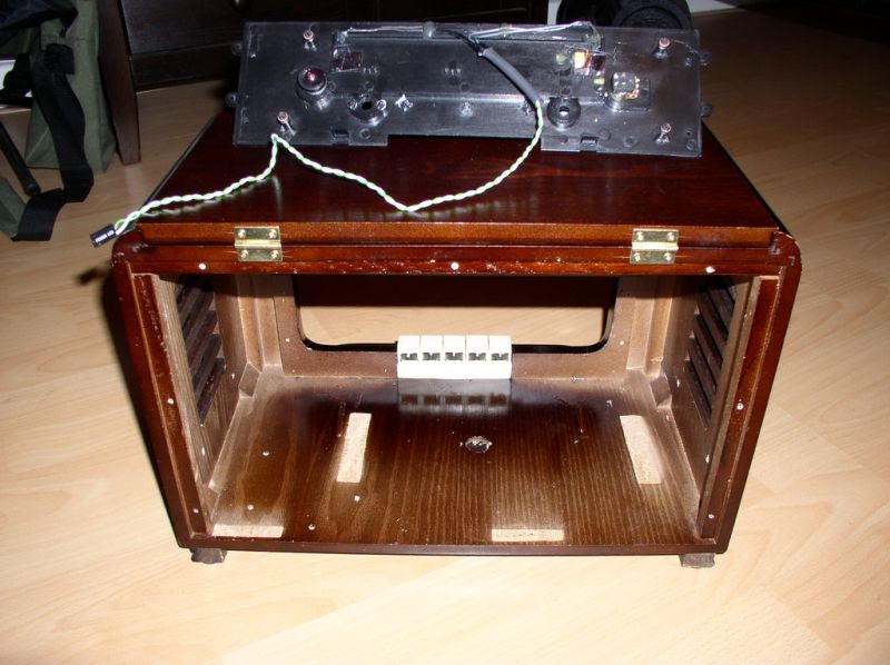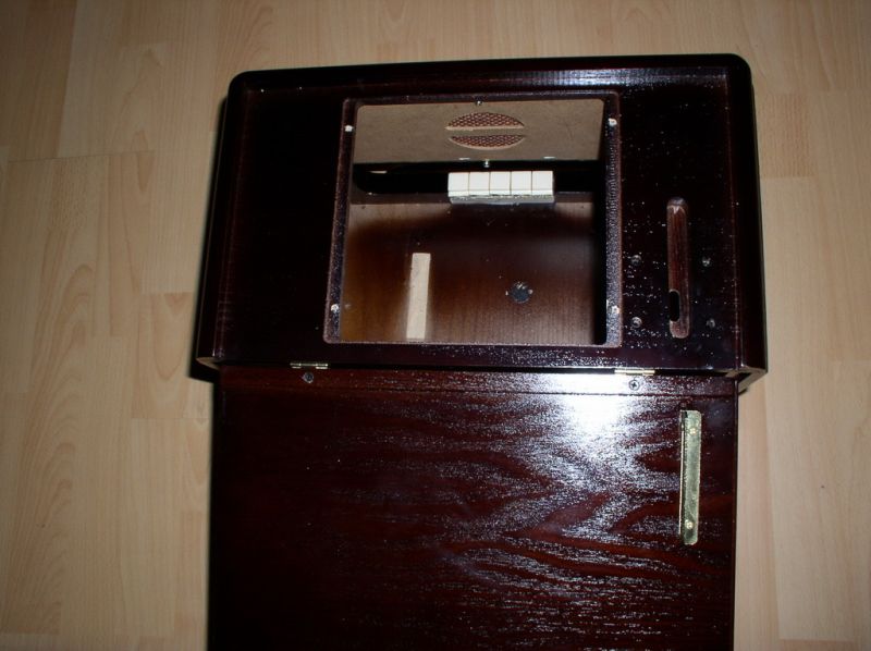Das brachte dann aber interessante Vorteile mit sich. Das Gehäuse ist rel. klein, ich hab dann nicht so einen riesen Brummer im Wohnzimmer stehen. Das Ding ist komplett zerlegbar und in einem sehr guten optischen Zustand. Außerdem hats oben eine Klappe, was ganz neue Möglichkeiten eröffnet.