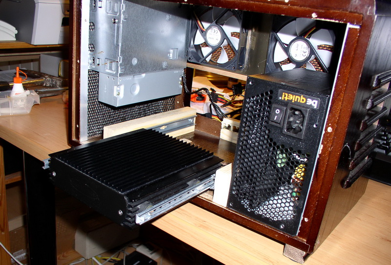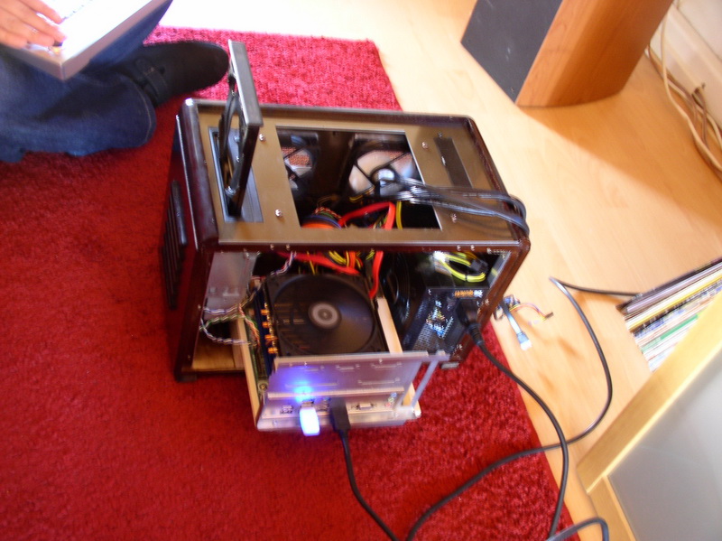 Ein Ziel des Ganzen ist noch die Möglichkeit eine potentere Grafiklösung einzubauen, um die Kiste auch mal mit auf eine Lan-party mitnehmen zu können. Bei einer Gehäusetiefe von 18cm kommt wohl nur der Einbau quer zum board in Frage.