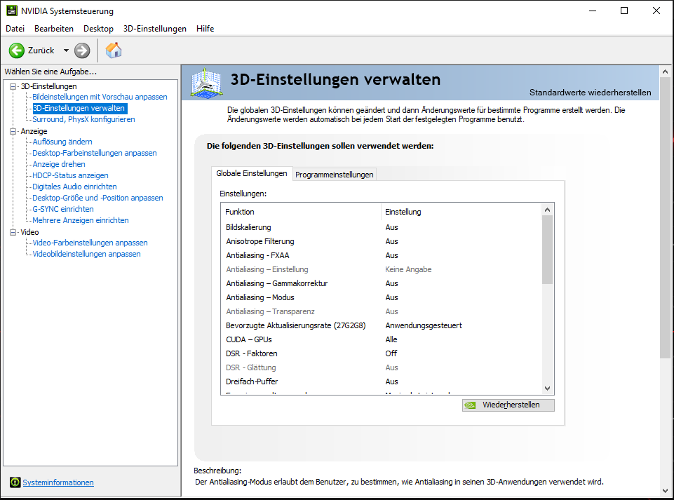 - Sämtliche Einstellungen im Control Panel (auch unter Standardeinstellungen probiert)